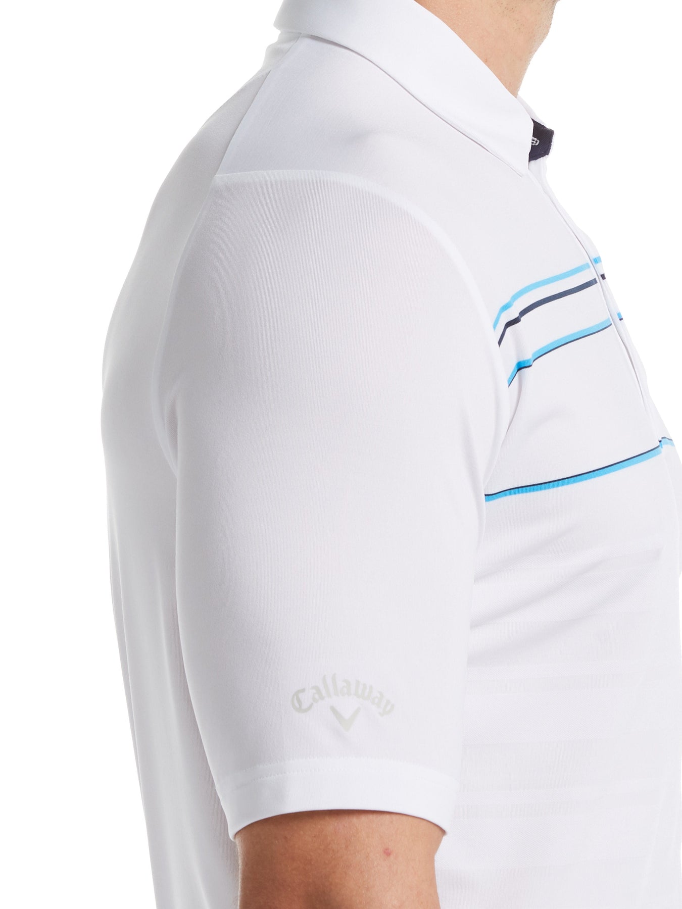 Be stylish and comfortable in this Callaway golf polo. An engineered stripe print with textured chest adds flair to the men's golf shirt. Swing Tech technology and stretch fabric ensure less restriction and deliver a full range of motion with every swing. Moisture-wicking technology keeps you cool and dry, and UPF 40 offers protection from harsh UV rays.