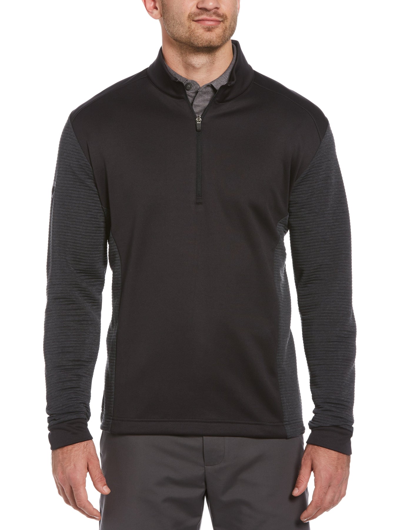 With this Weather Series™ Callaway men's golf jacket with mock collar in your golf wear collection, cold weather won't put you off your game. The lightweight, 1/4 zip fleece provides a layer of warmth, while ottoman fabrication adds a textured, ribbed feel for comfort and style. Insulated thermal fabric creates a barrier between you and the cold, and Opti Dri™ moisture-wicking technology keeps you dry. Swing Tech™ technology delivers full range of motion for a flawless swing even when layered up.