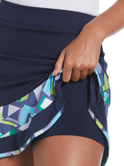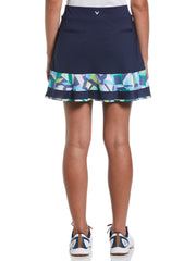 A ruffled hem featuring a dynamic colliding chevron print adds a fresh, modern twist to this women’s golf skort from Callaway. Made from a soft, lightweight jersey knit fabric, this athletic skort has moisture-wicking technology to help keep you cool and dry as you play. The material features a hint of stretch to help ensure a flattering and flexible fit, while TrueSculpt helps to smooth your silhouette. A great option for eco-conscious golfers, the ladies’ golf skort is made with 95% recycled polyester. Pockets at the back add a practical finishing touch, providing space to stow small items while you’re moving around the course or enjoying a sunny stroll around town.
