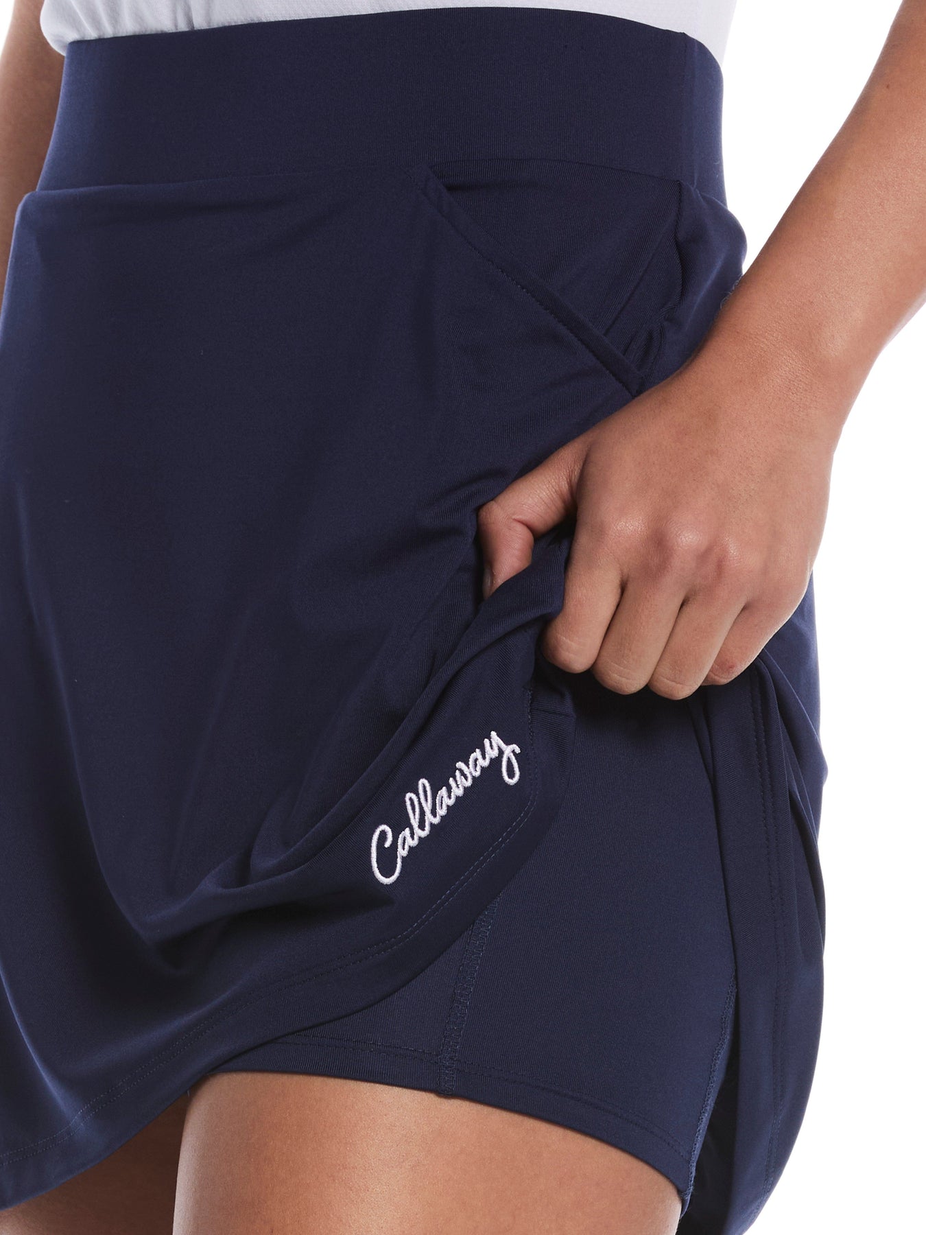 This feminine and flattering golf skort from Callaway is a great choice for any golf clothing collection. Crafted from lightweight fabric for comfort on the course, this women's golf skort also includes stretch for comfort and easy movement. Moisture-wicking technology helps you feel dry as your game heats up while sun protection helps block harsh UV rays. This ladies golf skort is finished with a double ruffle and the Callaway logo for added style.