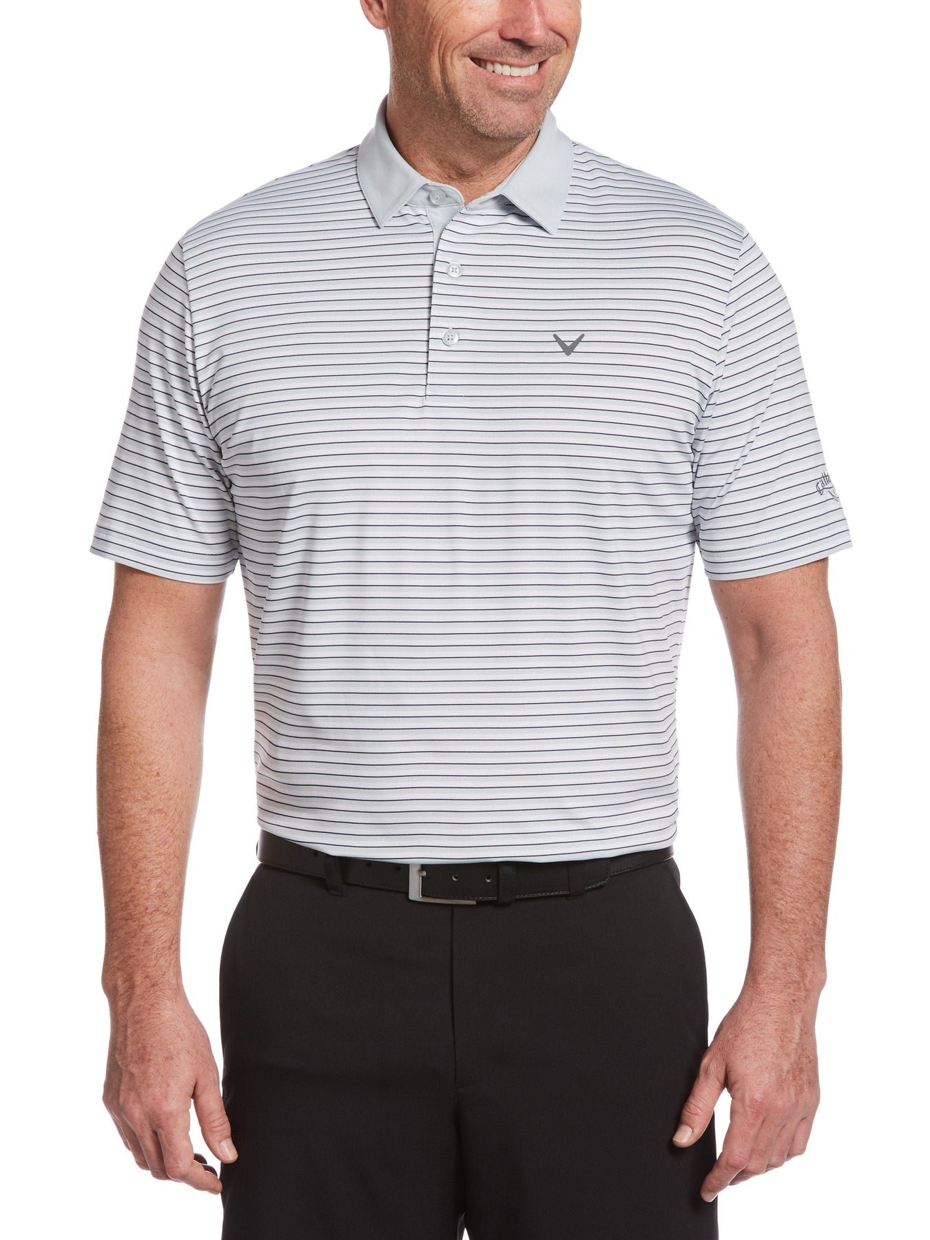 This refined Callaway men's golf polo features a stylish three-color yarn-dyed stripe print and contains stretch to maximize your range of motion. Built-in Opti Dri™ moisture-wicking and cooling technologies pull sweat and heat away from the skin to keep you cool and dry. This handsome golf shirt is equipped with UPF 40 protection to block out the sun's harmful rays while you play.
