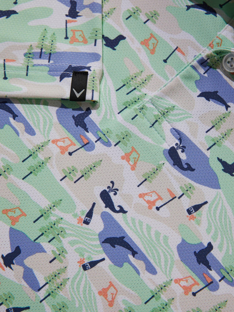 This men's golf polo shirt from Callaway is made with stretch and Swing Tech™ to provide a full range of motion that helps ensure seamless play. Crafted from recycled polyester and lightweight, single knit fabric, this golf shirt is also fully ventilated for cool comfort. The classic design is elevated with an abstract coastal golf print to give your golf wear an eye-catching touch.