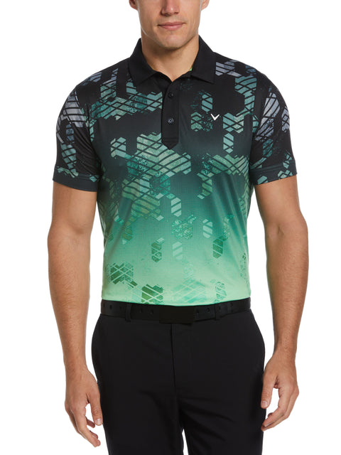 This fun and functional men's golf shirt features an eye-catching all-over geo print. Durable single-knit fabric is enhanced with stretch for a flexible fit that follows your every move. This short sleeve golf polo has a self collar with three-button placket for custom comfort and easy on and off. With 30% recycled polyester content, this golf top is a fashionable choice you can feel good about.