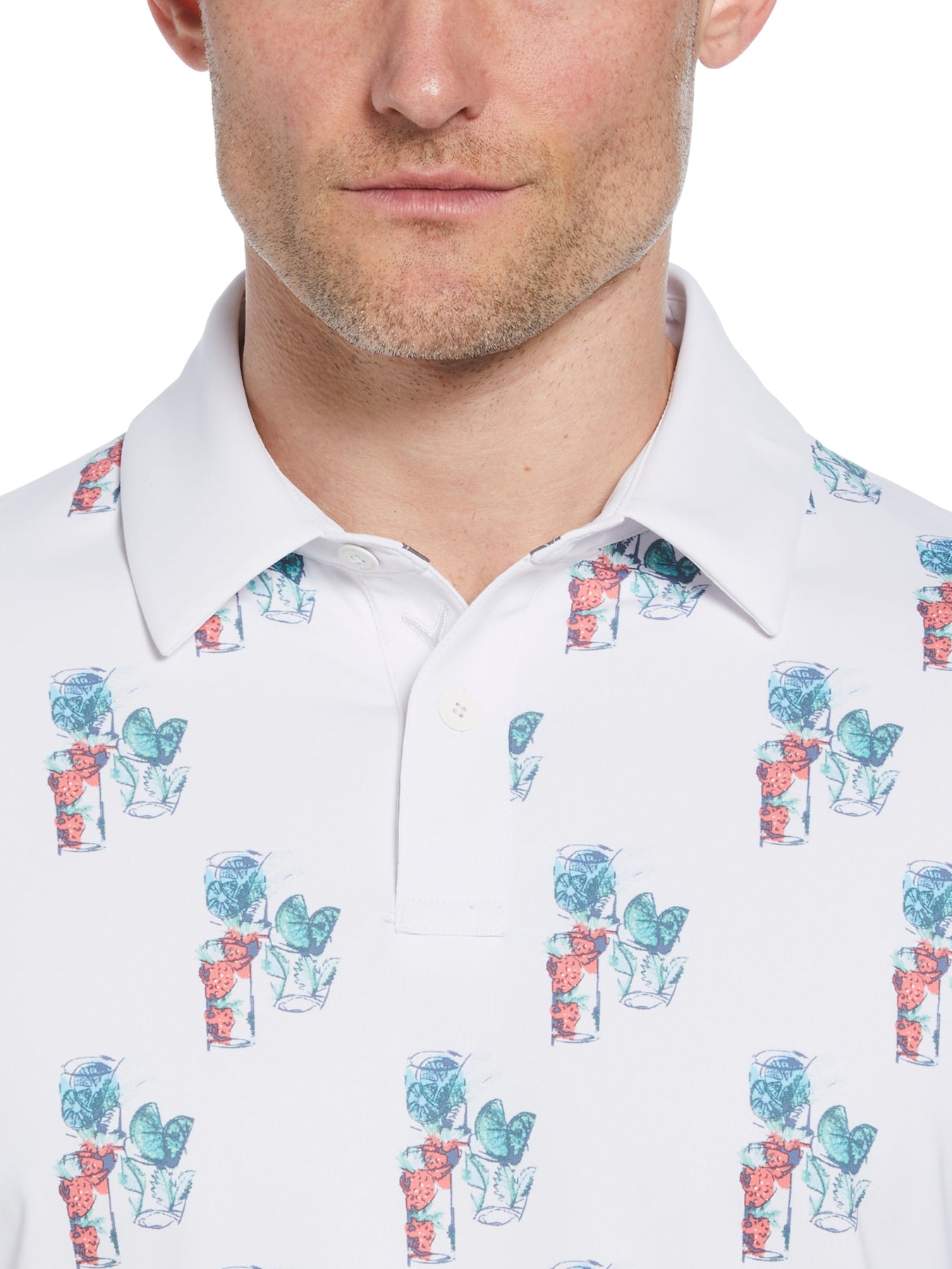 Make a statement on the course with this Callaway golf polo that features a golf cocktail-inspired print for an elevated look. Designed for performance as well, this men's golf shirt wicks away moisture and includes Swing Tech™ technology for unrestricted swings. Perfect for sunny days, this golf polo shirt also sports sun protection to block harmful UV rays.