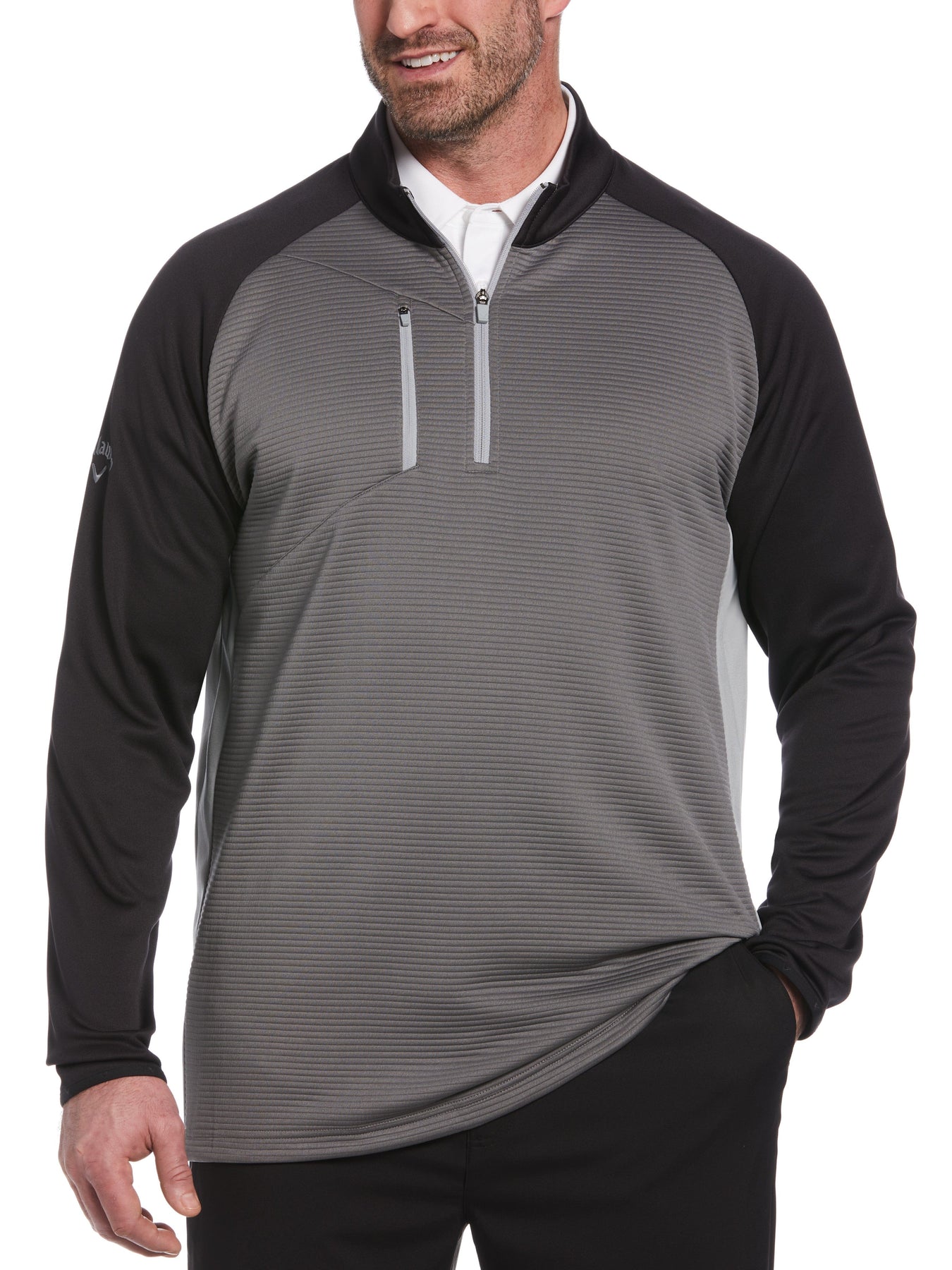 This Callaway Weather Series™ golf sweater is crafted from soft, midweight fleece for warmth that won't weigh you down. Thick, double-knit thermal fabric creates a barrier between you and the cold, while a high mock neck keeps the wind at bay. SwingTech™ technology lets you maximize your range of motion, and ottoman fabrication creates a textured, ribbed feel for comfort and style as you swing. A zippered chest pocket keeps essentials close by, and a 1/4 zip collar makes it easy to remove the men's golf pullover if the weather warms up.