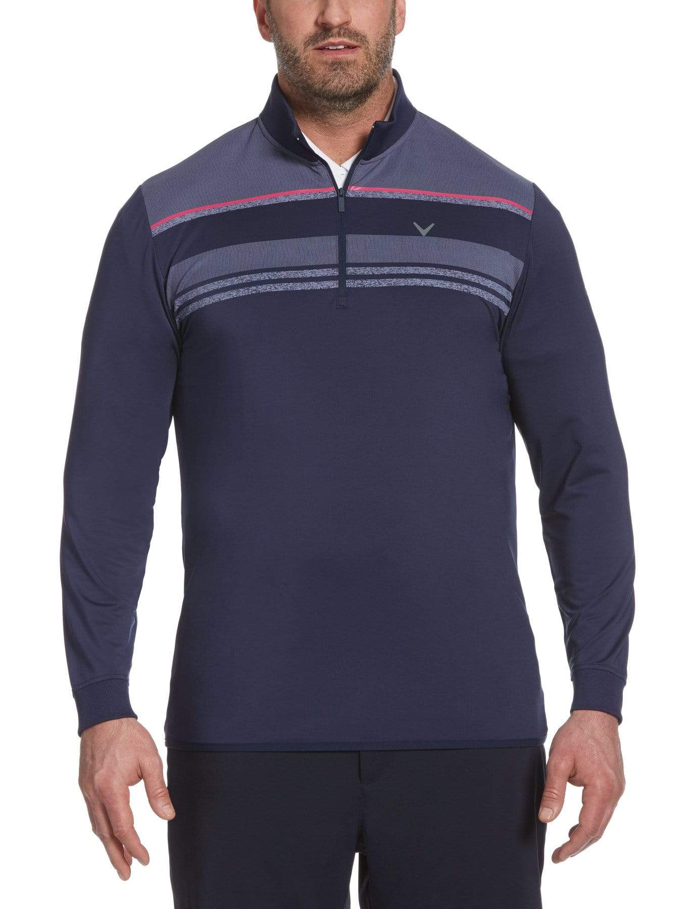 Play like a pro in chilly weather with this Callaway long sleeve golf shirt featuring a stylish chest block print. Insulated thermal fabric with added stretch and an extra soft finish helps you stay warm and swing comfortably. The golf pullover features UPF 50 to safeguard against the sun's harmful rays. A quarter zip mock collar easily adjusts for custom comfort, and it provides extra protection against the elements.