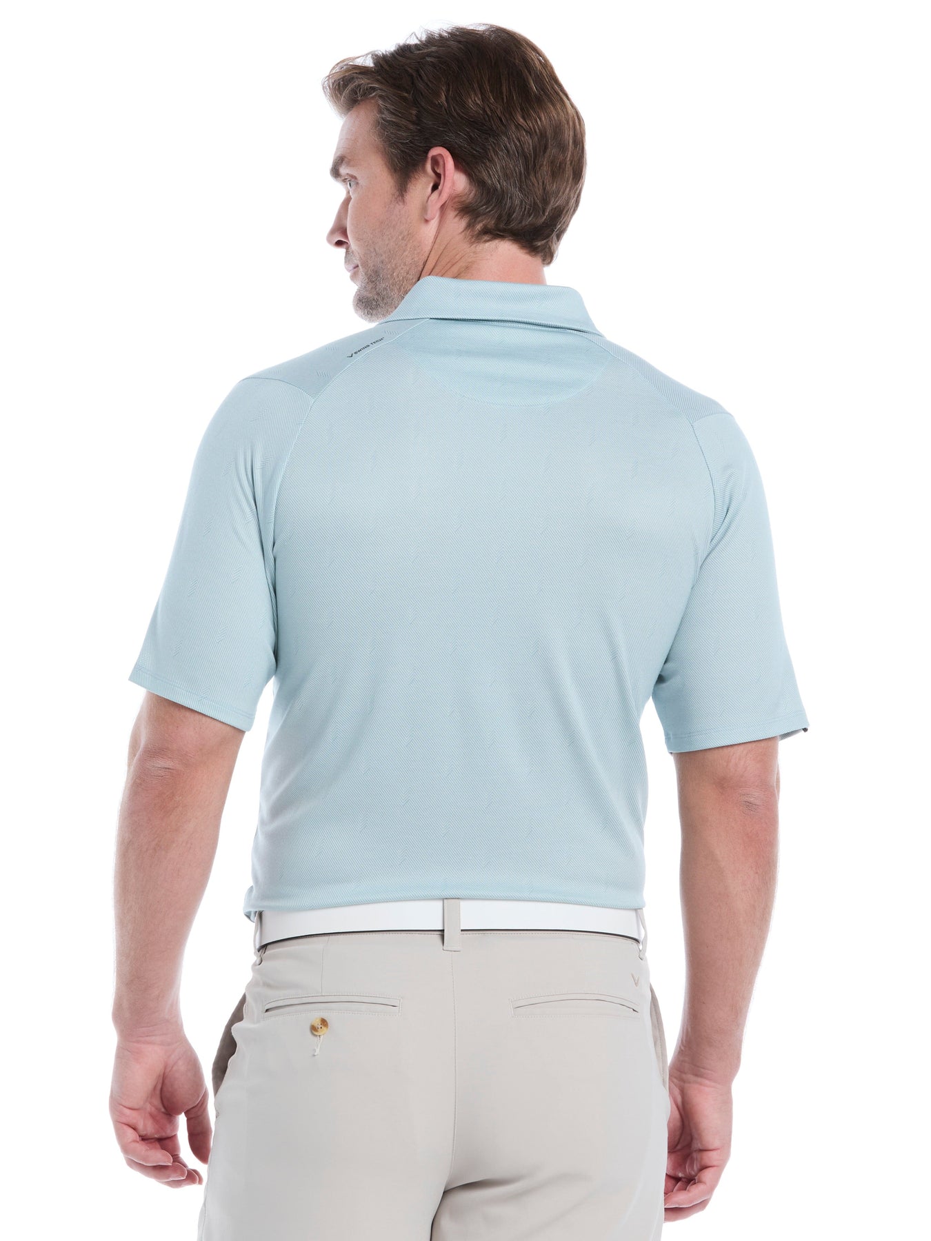 Elevate your golf game with this stylish Callaway Apparel golf polo. This polo shirt features a unique chevron twill jacquard design made for lasting performance. The easy-care, short-sleeve golf top is crafted from a comfortable blend of polyester and elastane, while the Swing Tech™ and stretch fabric help to facilitate a full range of motion with every swing. With UPF 50 sun protection and moisture-wicking properties, it helps keep you dry and protected.