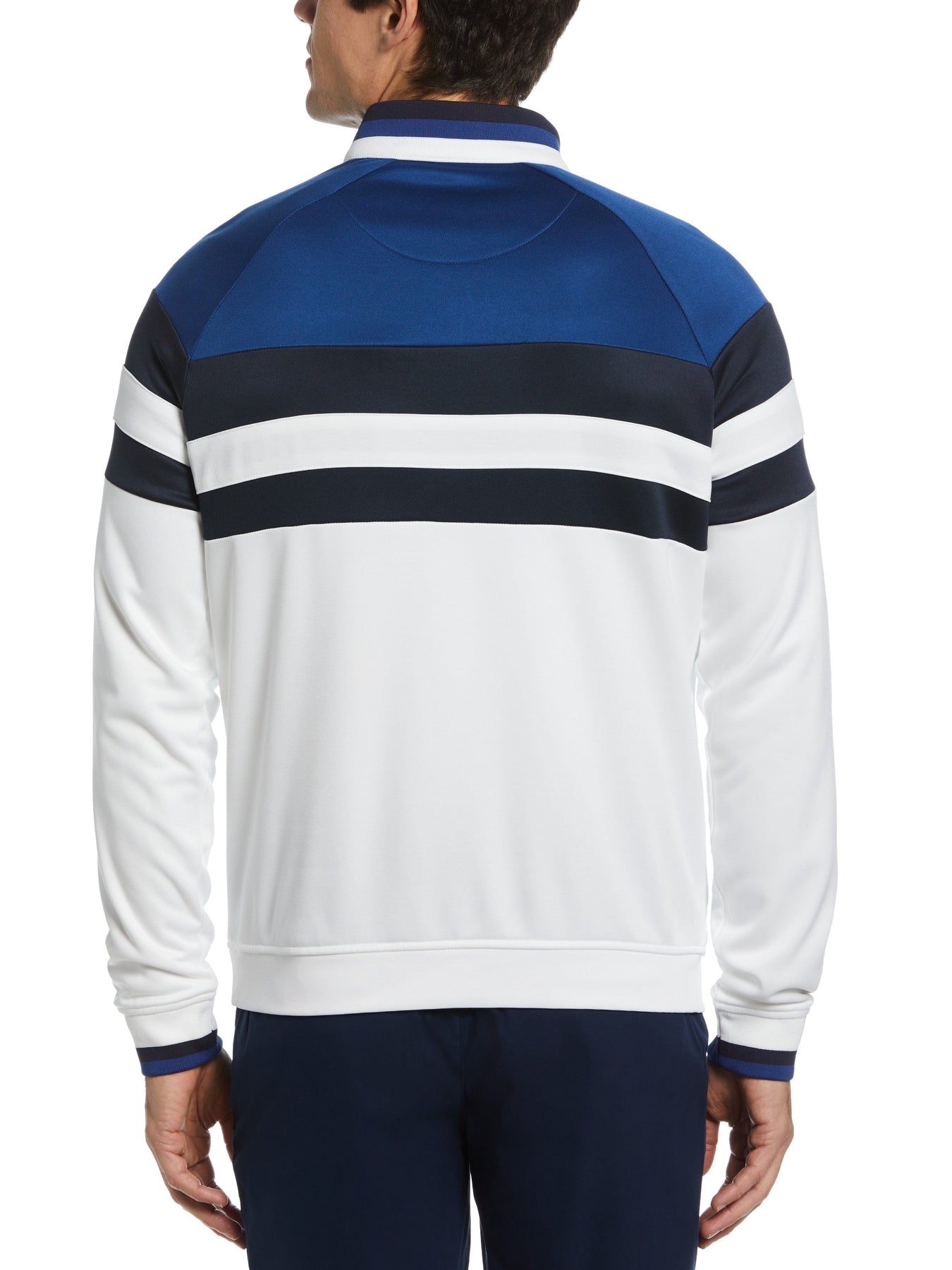 On or off the course, this Callaway men’s golf jacket has your back. The sporty color-block stripes add a fresh, fashionable look and added stretch offers a full range of motion as you bend and swing. A self mock-neck collar and ribbed cuffs and hem provide added protection from the elements in the wind or rain. This golf pullover is crafted with a quarter-zip closure for easy on and off and zippered front pockets for secure hands-free storage space.