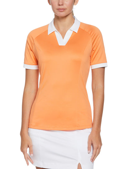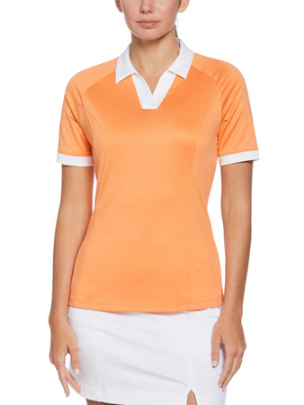 Color blocking and an open V-placket add some modern punch to this versatile women’s golf polo from Callaway. The ladies’ golf top is made with a soft and stretchy jersey knit fabric to help you stay comfortable as you make your way from the first hole to the 18th. Moisture-wicking technology moves sweat away from your body to help keep you dry when while you play. Innovative Swing Tech™ technology helps to ensure a full range of motion, so you can make each shot without feeling constricted. A top that golfers can wear with pride, the short sleeve polo is made using 95% recycled polyester.