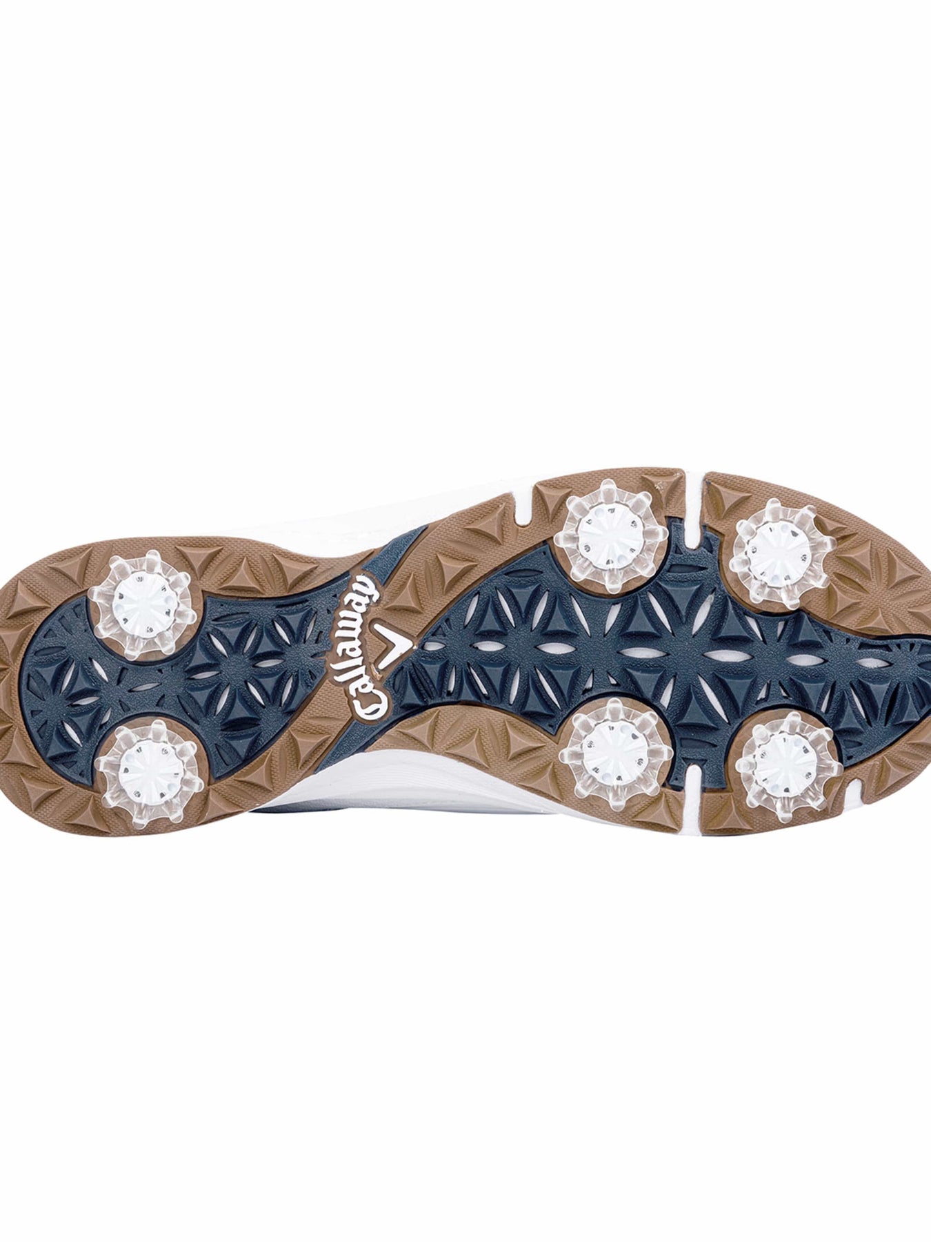 Designed with stability in mind, the Callaway Coronado v2 women’s golf shoes feature spiked dura-rubber outsoles to help you maintain your footing on slick wet grass. Great for changing weather conditions, the golf shoes for women feature durable microfiber leather uppers with Opti-Dri™ waterproof protection to help prevent your feet from getting soaked during wet weather. The lightweight Forged DX™ EVA midsoles and PLUSfoam insoles provide essential underfoot cushioning, while Opti-vent™ mesh liners add breathability to help keep your feet cool. The Pulsar cleats are removable, making them easy to clean or replace as needed.