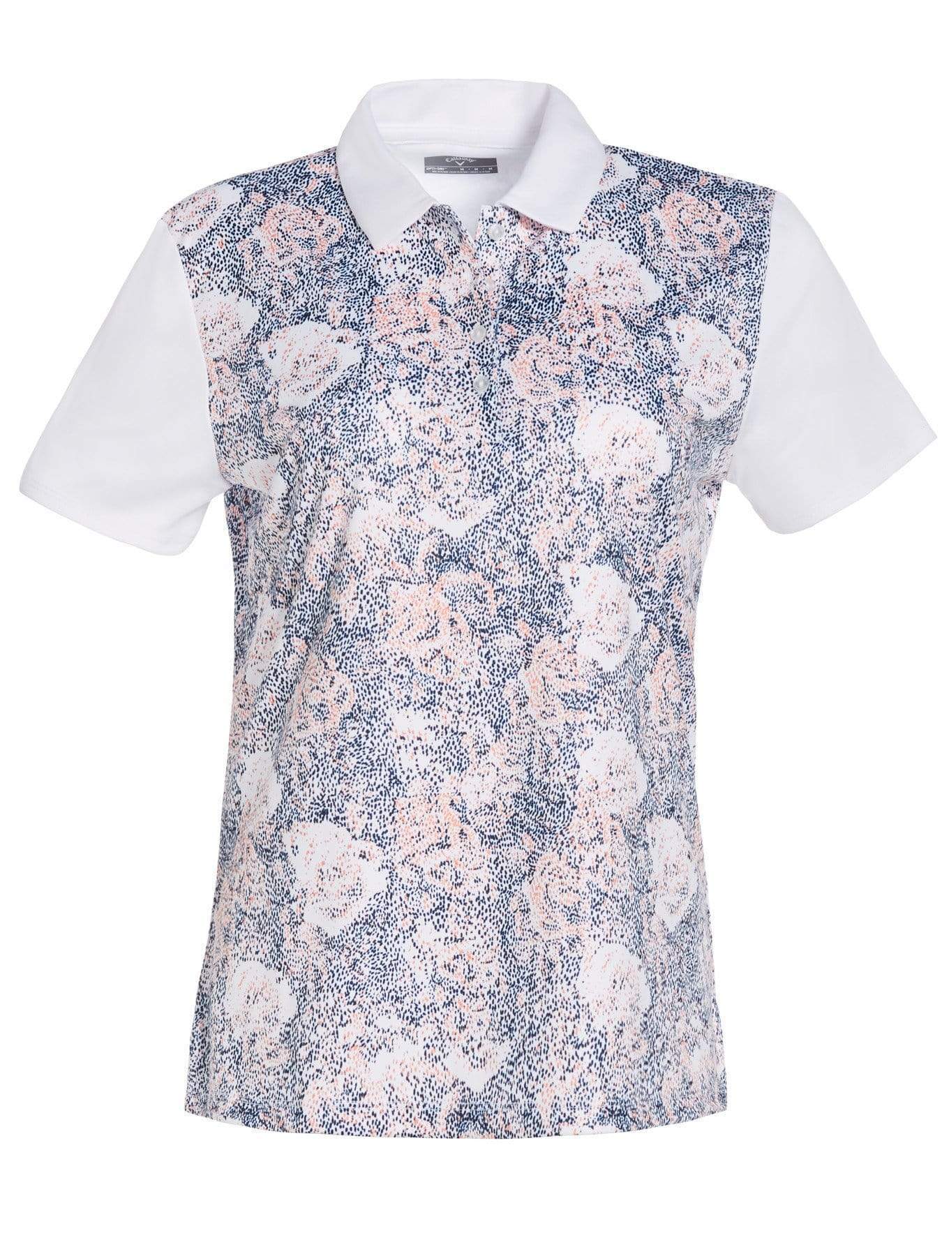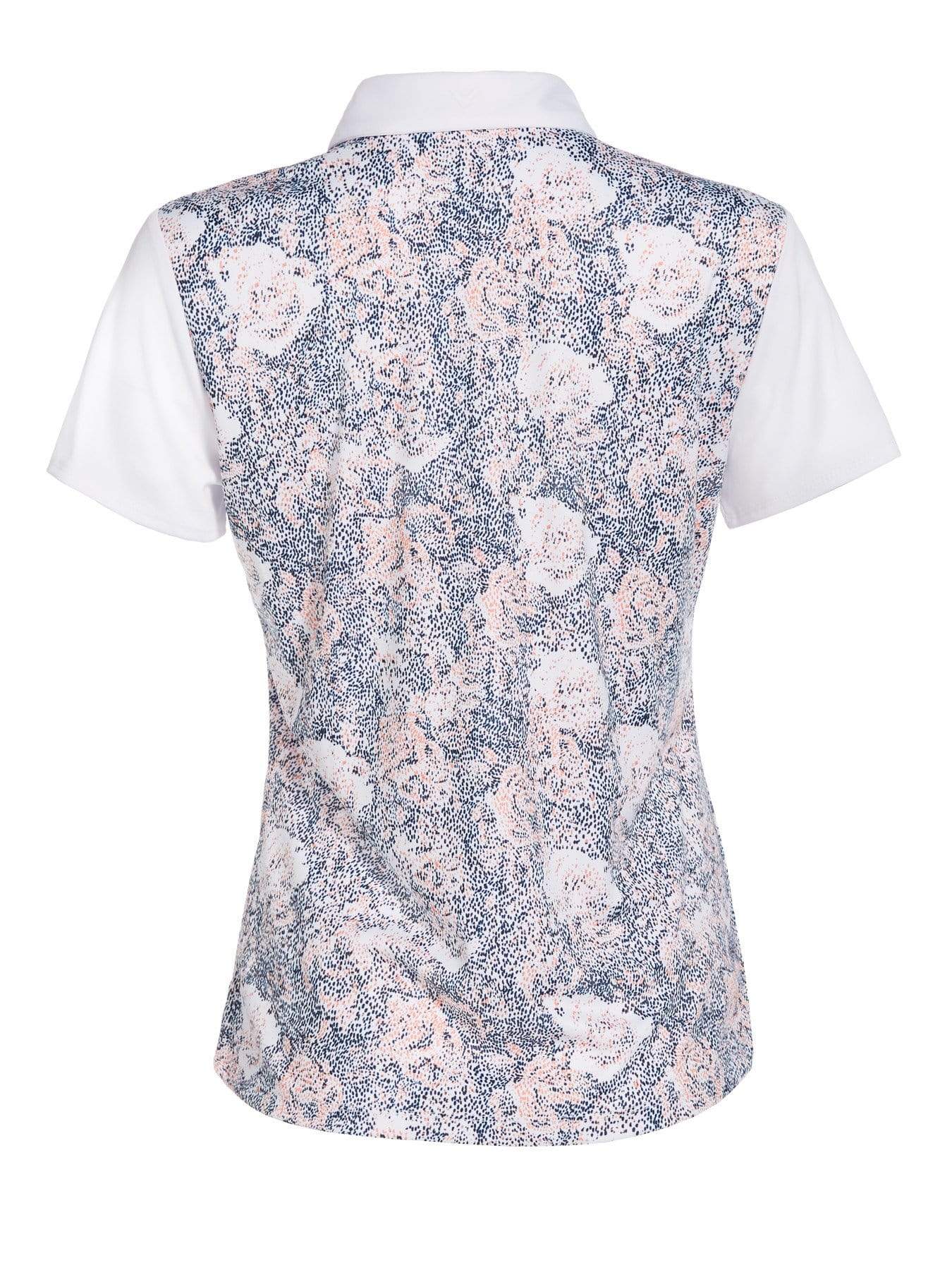 Putting a fresh twist on the classic floral print, this Callaway women's golf shirt features a cool dotted effect. The ladies' golf top is made with interlock knit fabric, which boasts a hint of natural stretch for added ease of movement. Moisture wicking moves sweat away from your body to help you stay dry, while sun protection technology helps to prevent harmful UV rays from penetrating through the fabric.