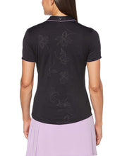 Stay cool and focused on your game in this Callaway women's golf shirt. It's designed with mesh panels at the back for ventilation and Opti Dri™ moisture-wicking technology to keep you dry and comfortable. Made with a generous amount of stretch, this ladies' polo shirt lets you move freely throughout each round. UPF 50 protection helps to guard against the sun's damaging rays. The golf polo has an embossed floral print for a stylish modern look, while contrast piping along the edges gives the collar a little extra definition.