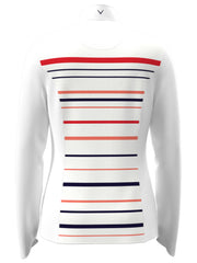 Multi-colored engineered stripes across the front and back panels elevate the look of this sleek ladies' golf top from Callaway. The women’s long sleeve golf shirt is designed to wick away moisture to help keep you feeling fresh throughout each round. It’s crafted from a soft and lightweight single knit fabric, with added stretch to help provide a full range of motion. Sun protection technology helps to block UV rays from passing through the material.