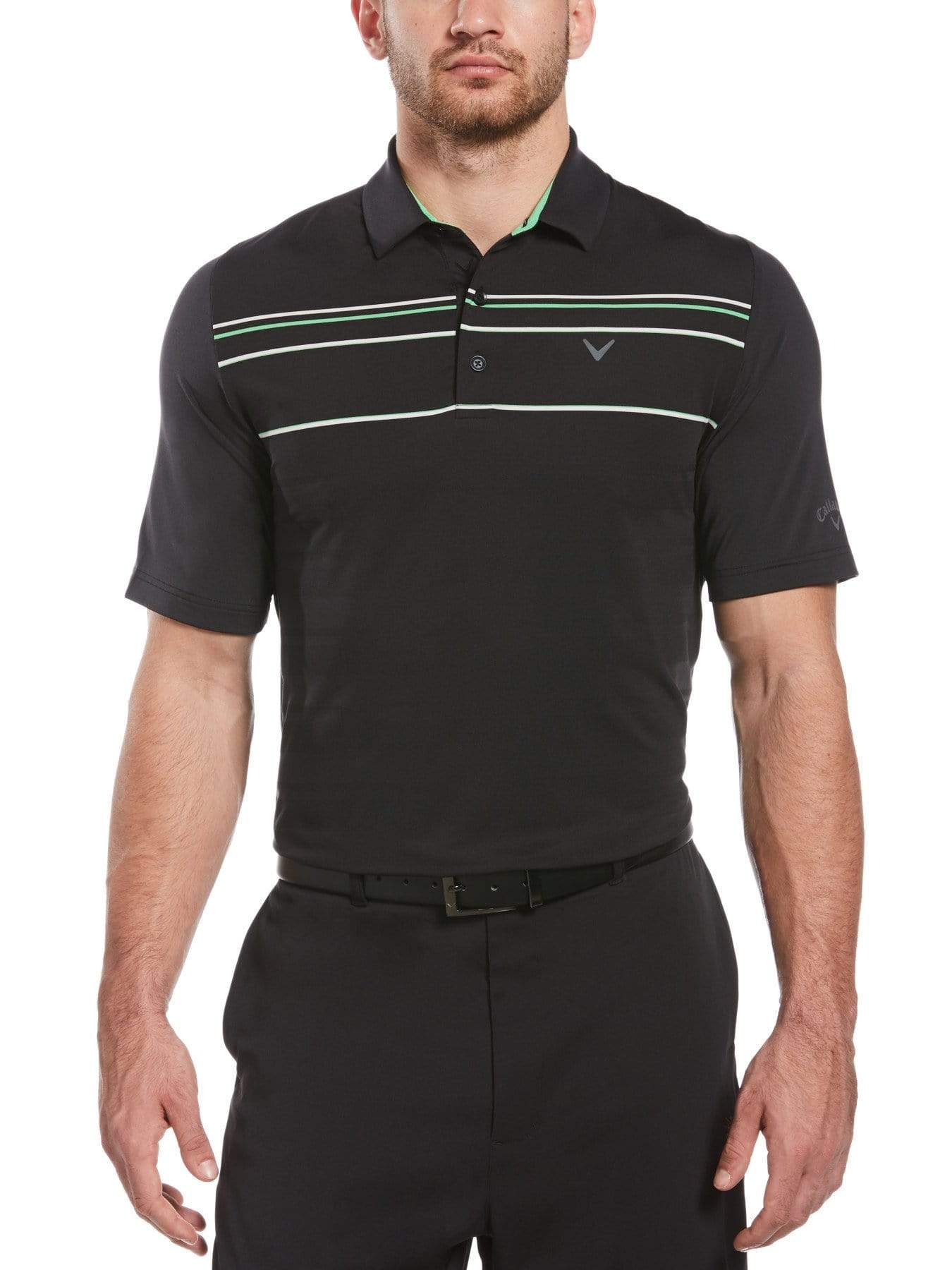 Be stylish and comfortable in this Callaway golf polo. An engineered stripe print with textured chest adds flair to the men's golf shirt. Swing Tech technology and stretch fabric ensure less restriction and deliver a full range of motion with every swing. Moisture-wicking technology keeps you cool and dry, and UPF 40 offers protection from harsh UV rays.
