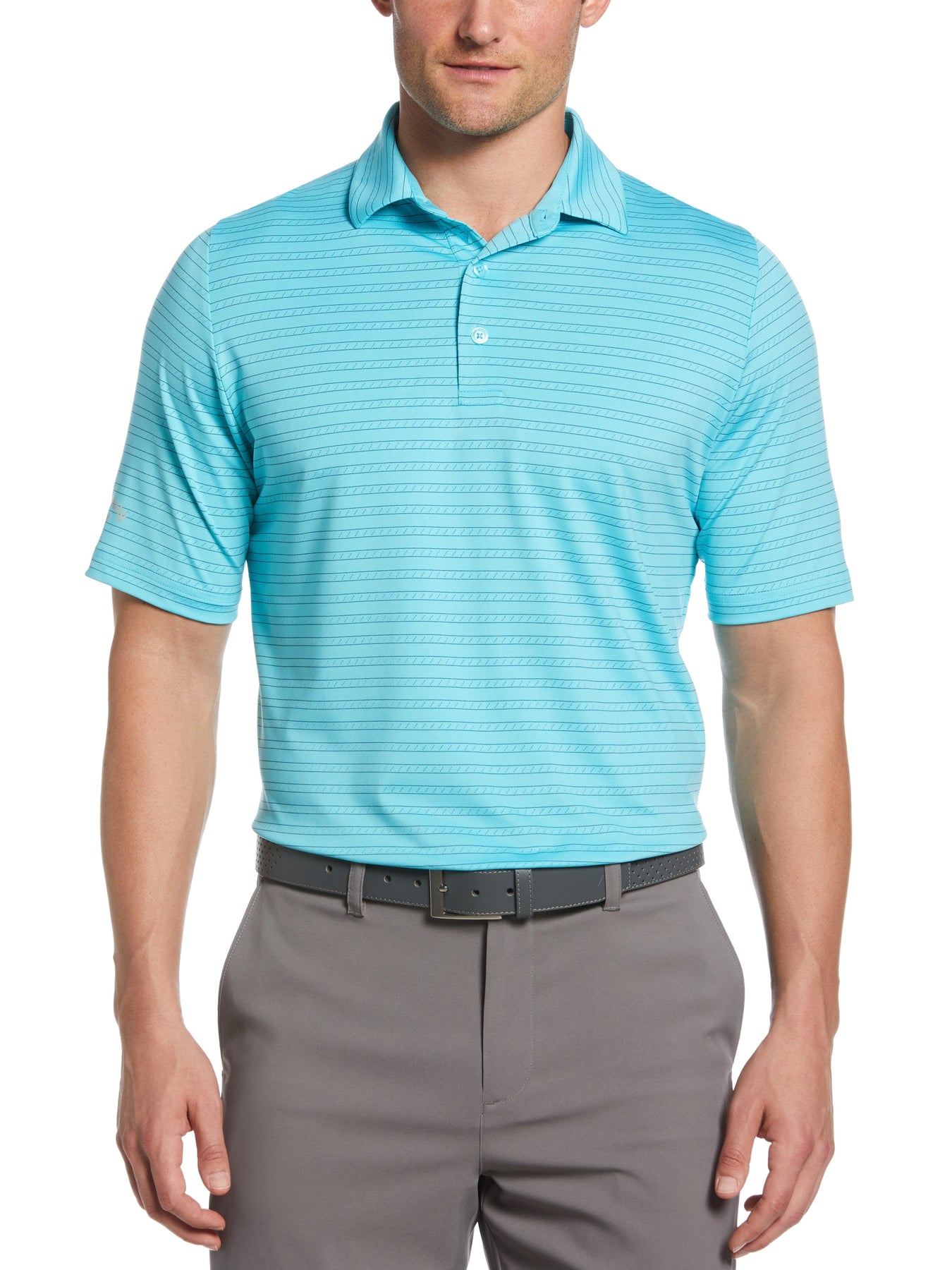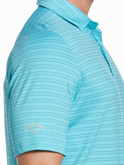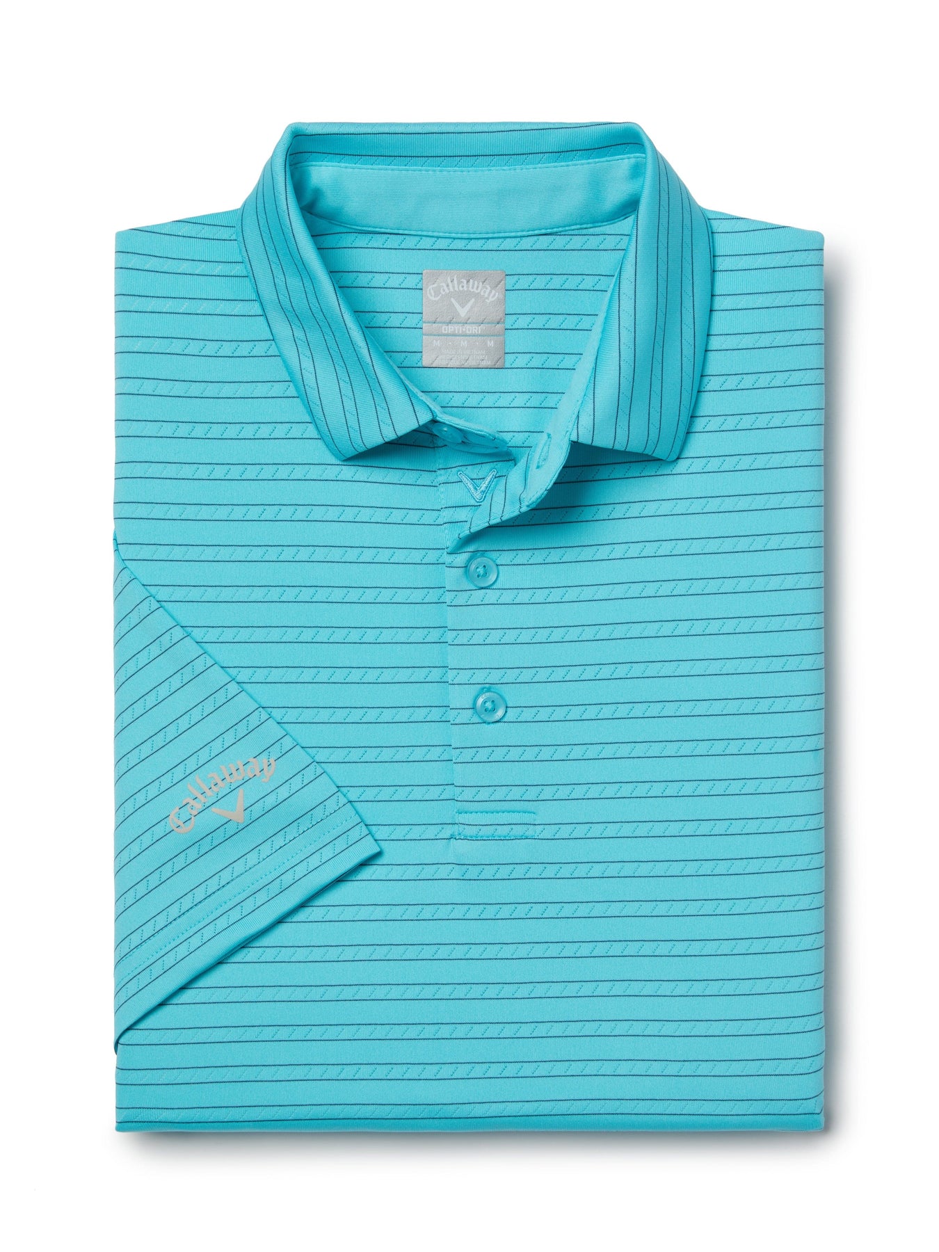 Keep your cool on the course in this Callaway men's golf shirt. Ventilated fabric with cooling technology circulates air through this short sleeve golf polo while Opti-Dri™ technology wicks moisture away from the skin. Swing Tech™ technology and added stretch help ensure a full range of motion so you can bend, twist, and swing in comfort. The versatile fine line print and classic three-button placket, are sure to make this one of your go-to golf tops.