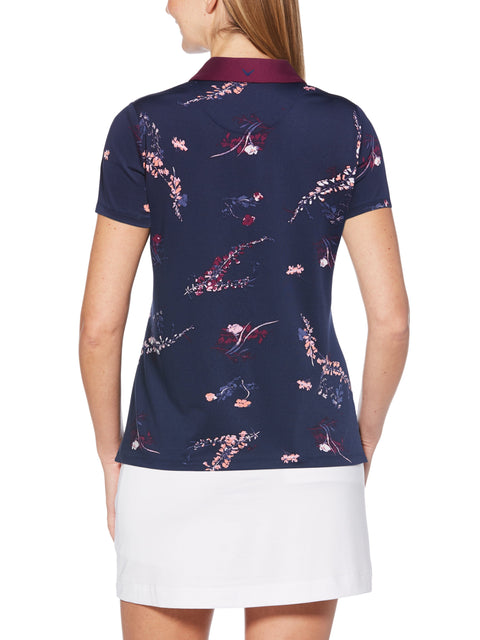 A feminine floral print flows all over this Callaway golf shirt. The women's golf polo top has a complementary colored collar and a unique keyhole designed placket. Opti Dri™ technology wicks moisture from your skin to keep you cool and dry as you play. Stretch in the soft jersey material allows a maximum range of motion so you never feel constricted. UPF 50+ technology protects your skin by preventing UV rays from penetrating the fabric. Flattering and full of performance features, this ladies golf top is sure to become a favorite.