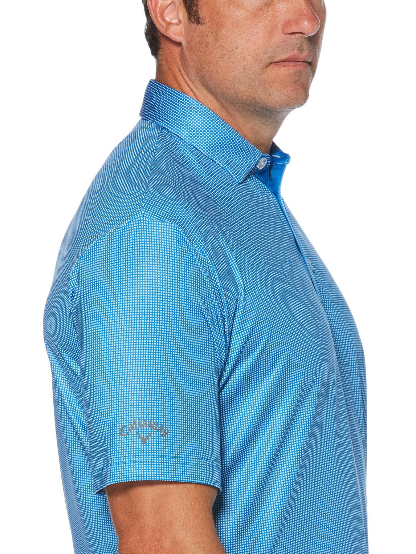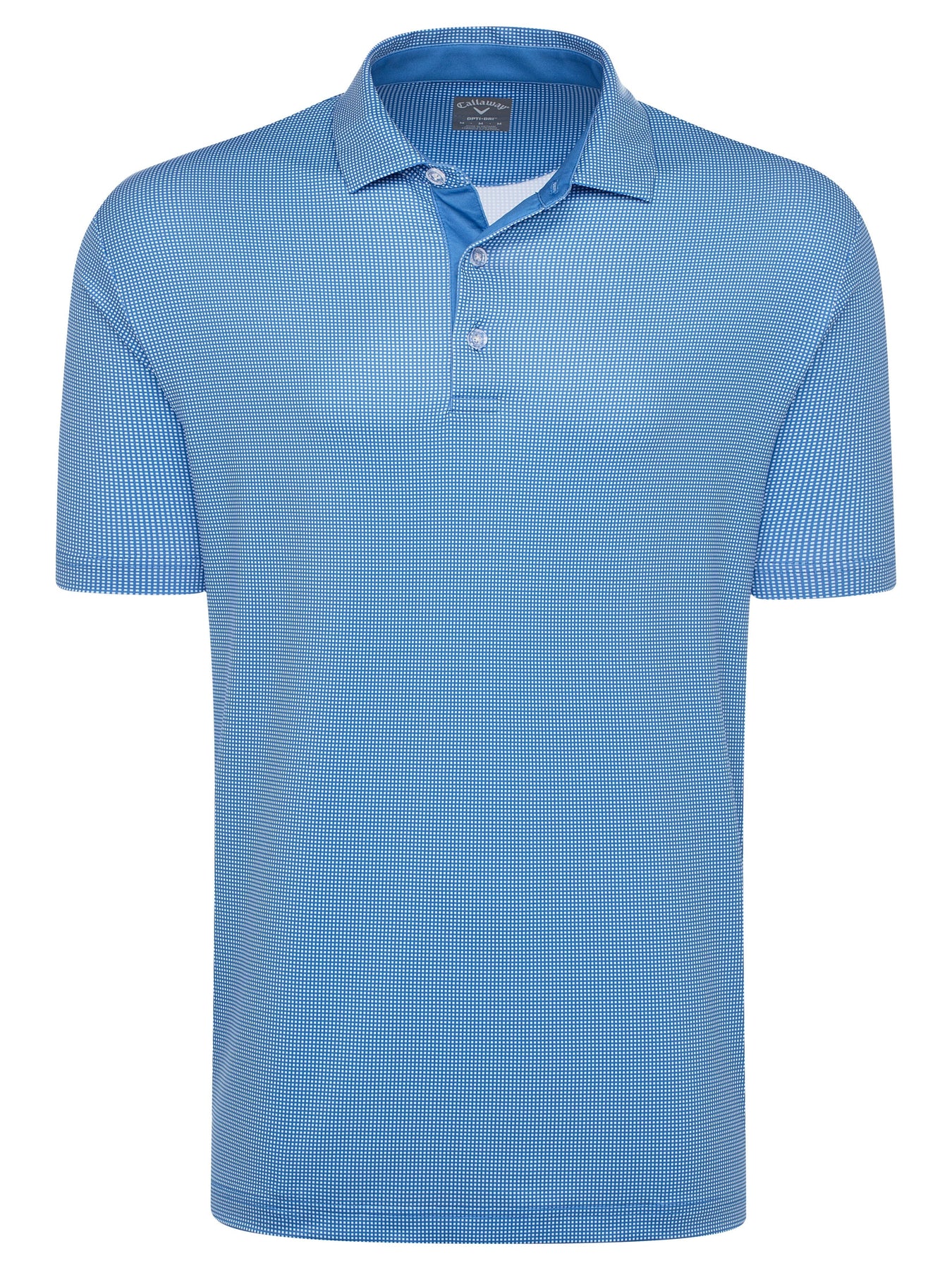 This stylish Callaway men's golf polo offers a modern take on go-with-anything gingham. The printed polo shirt is made with lightweight jersey knit fabric with added stretch to allow for a full range of motion. Moisture wicking moves sweat away from your body to help keep you dry, while sun protection guards against harmful UV rays.