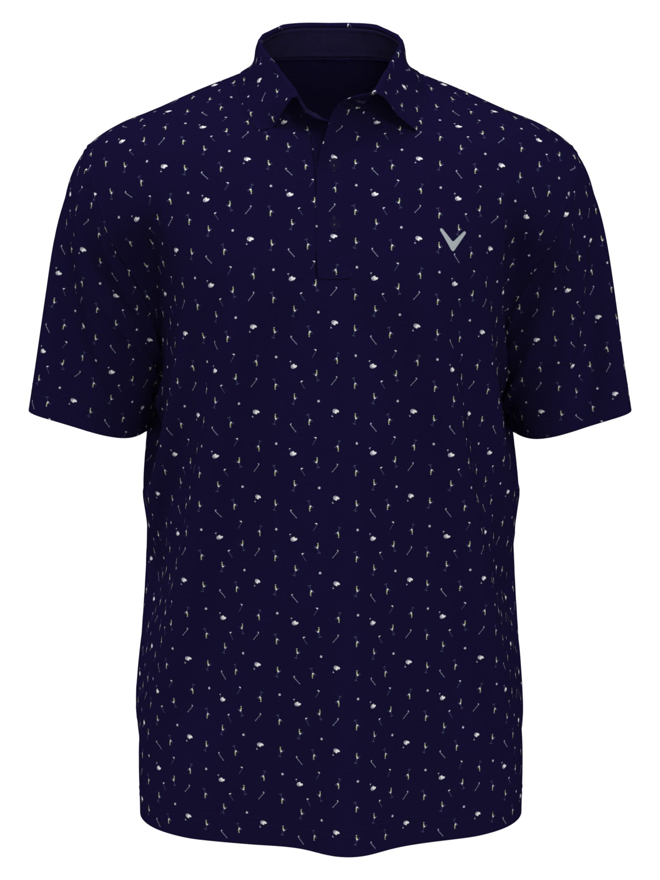Ideal for days when you’re ready to relax, this Callaway men’s polo shirt is covered with a fun print featuring items like golf clubs and martinis. The men’s golf top features added stretch to let you make each swing comfortably and with optimal form. The soft jersey knit fabric is light and easy to wear in warmer weather, and it wicks away moisture to help keep you feeling fresh, dry and ready to challenge another hole. The men’s golf top is finished with sun protection technology to help block damaging UV rays from passing through the material.