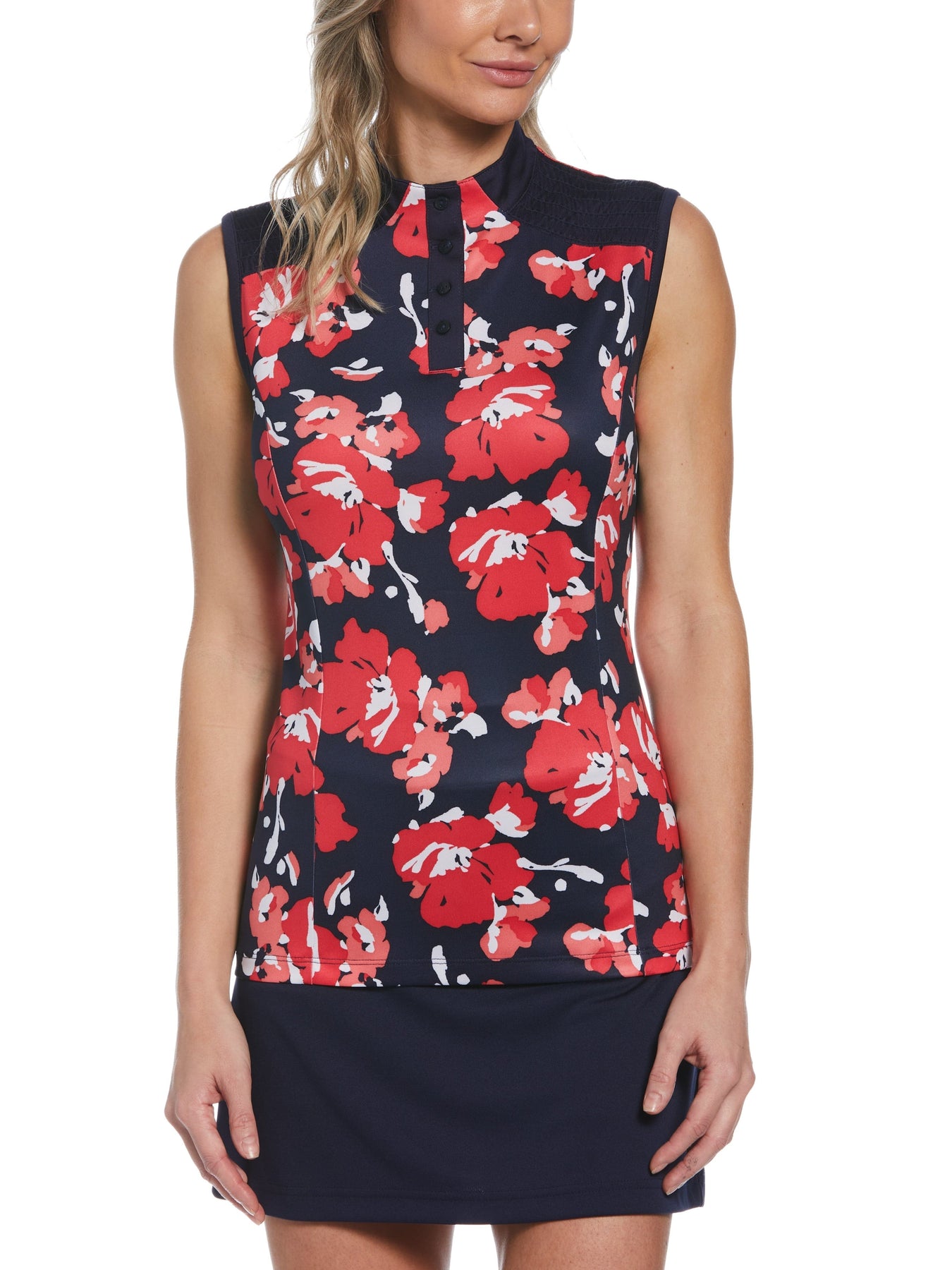 Bring some serious flower power to your game with this women’s sleeveless golf shirt by Callaway. A large-scale floral print and shoulder shirring detail draws the eye and a mock neck collar with four-button placket allows for easy on and off. This sleeveless golf top is made from a stretch jersey fabric that moves with you and contains 30% recycled materials for an eco-friendly advantage. It’s equipped with moisture-wicking Opti-Dri™ technology to help keep you feeling cool and dry as your game heats up.