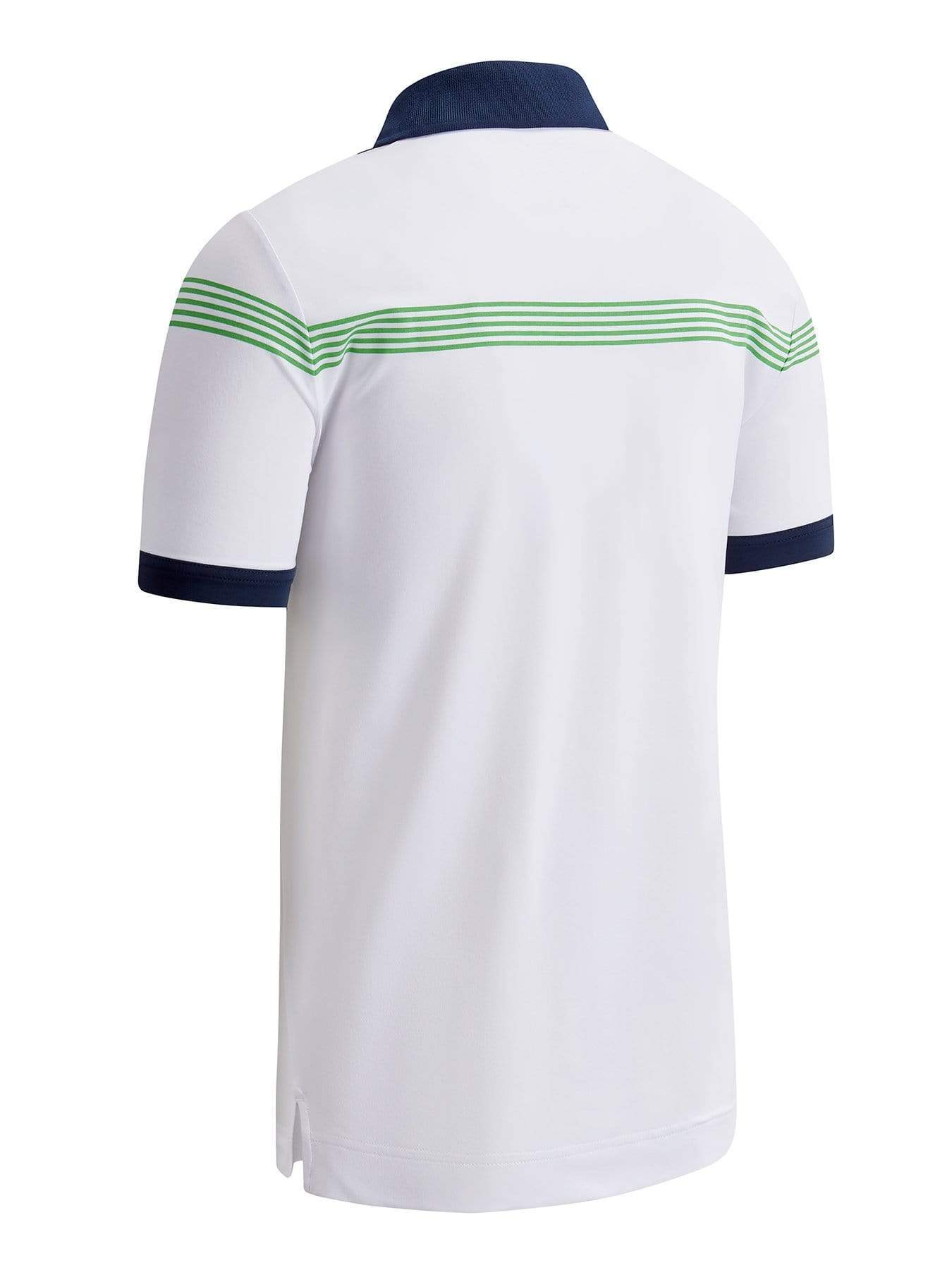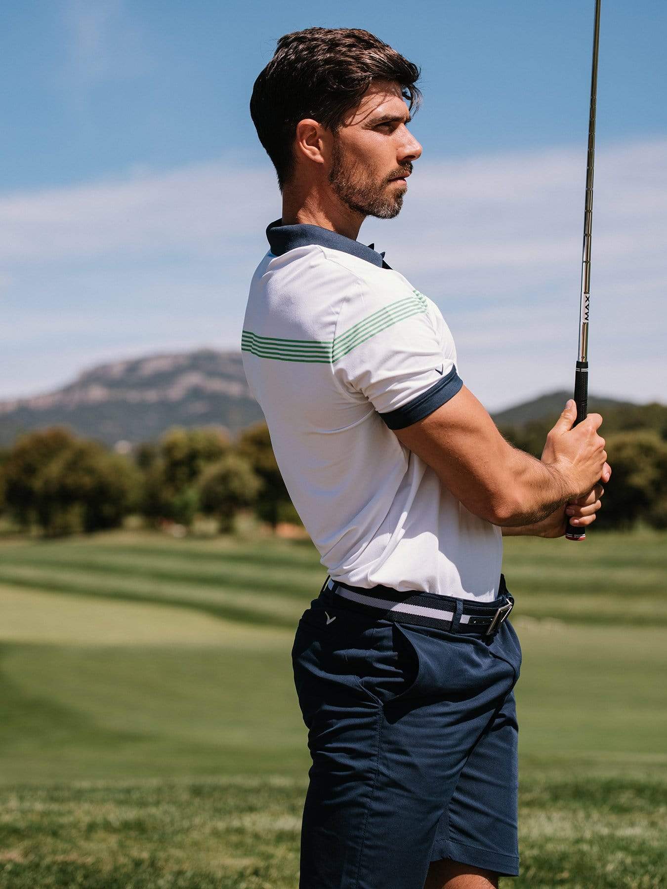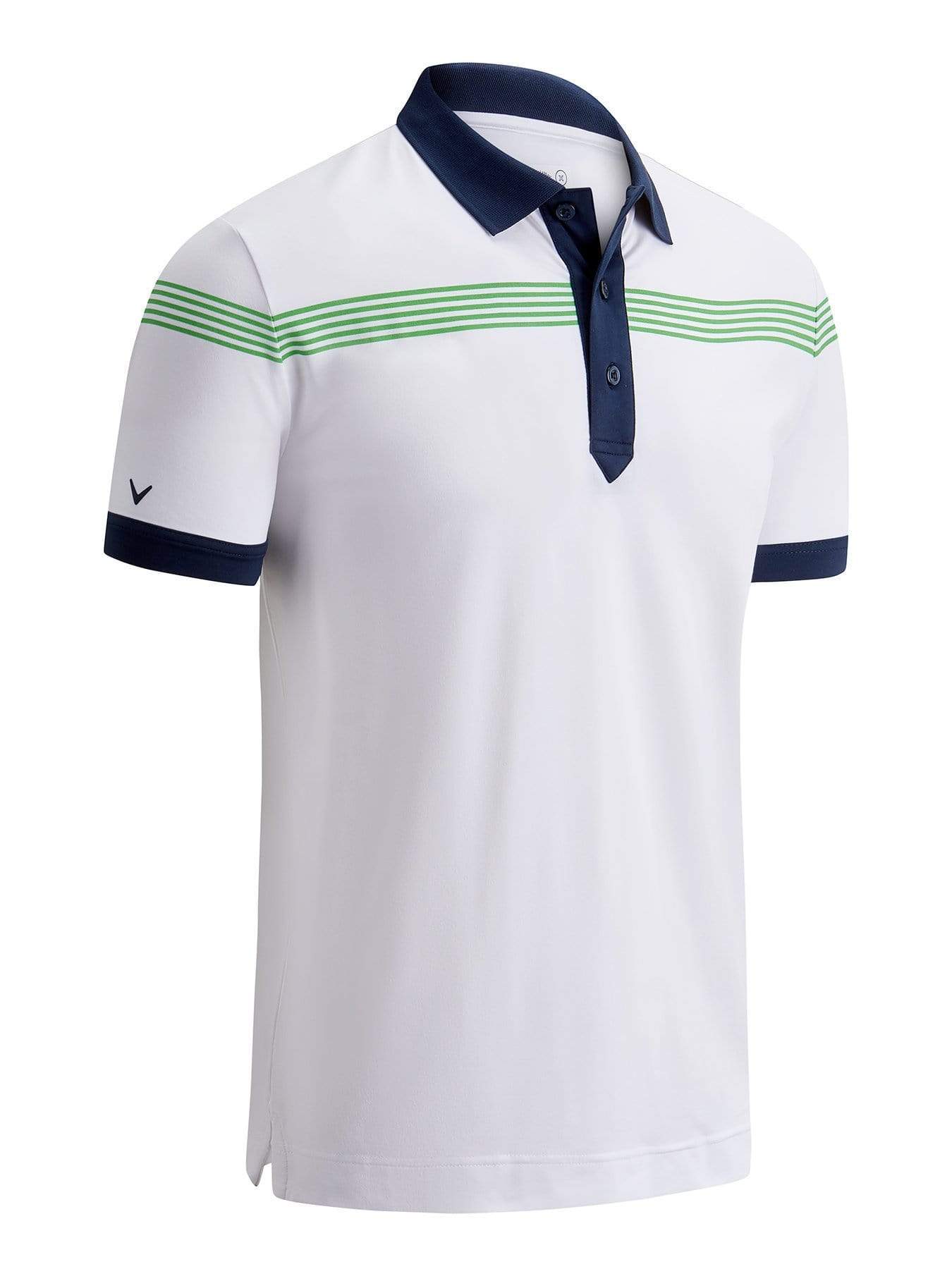 Its all in the details and this Callaway golf polo puts a fresh twist on a classic design. A linear print on the chest is paired with a contrasting ribbed collar and cuffs for unbeatable style on the course and off. Stretch fabric allows for a full range of motion with every swing. Moisture-wicking technology keeps you comfortable as you drive the ball with total confidence.