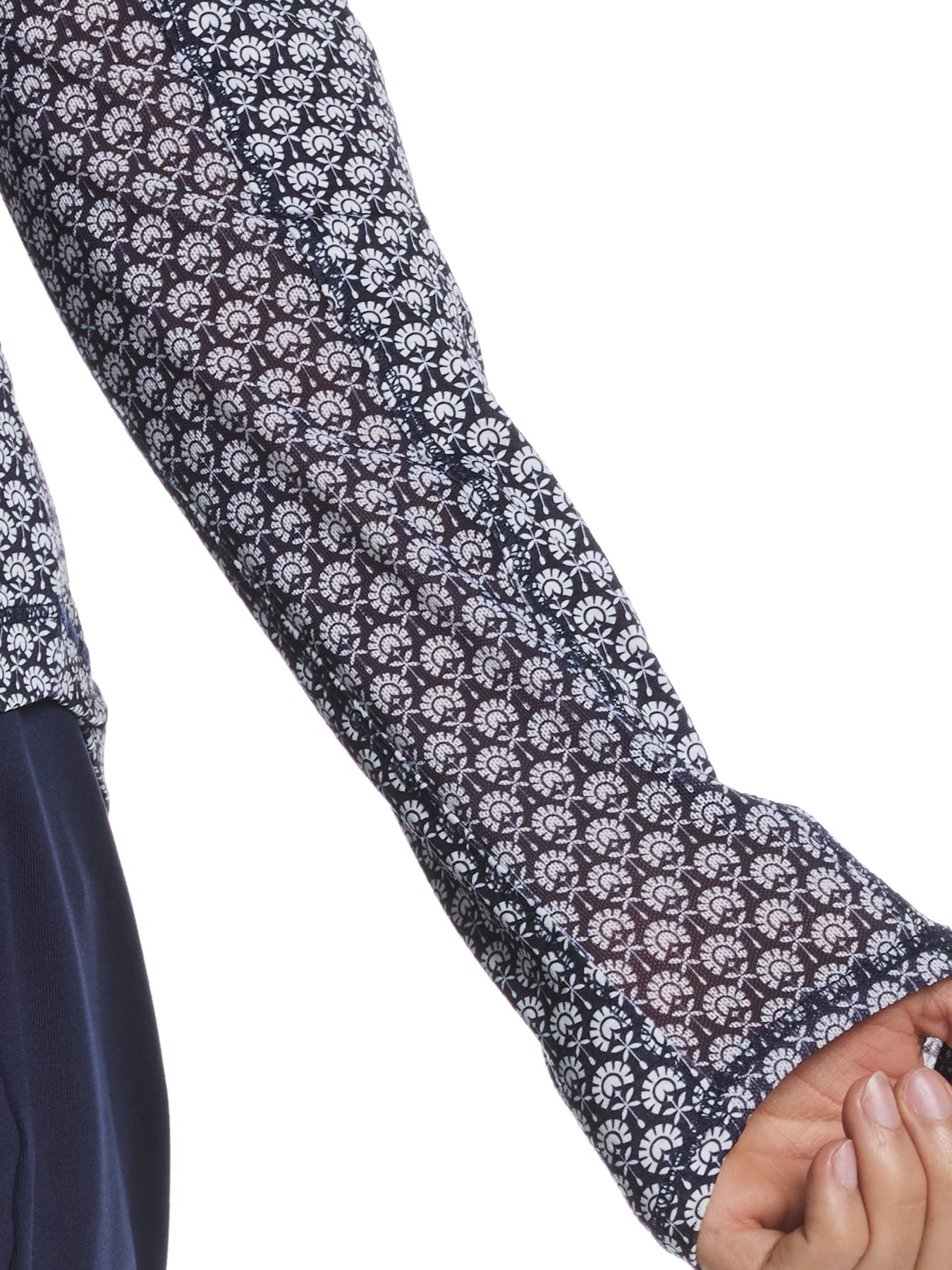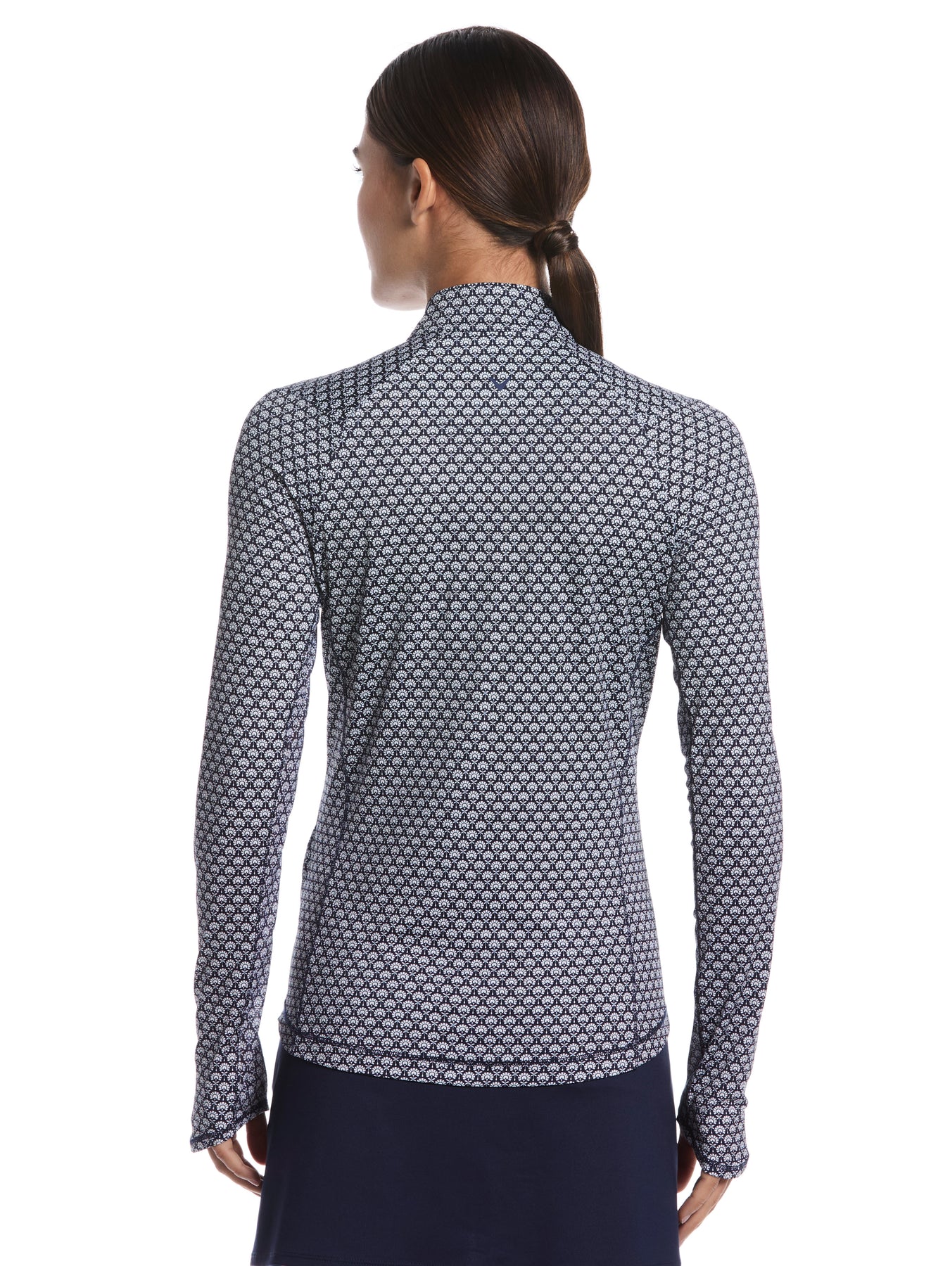 This elegant women's golf shirt combines sophisticated style with cutting-edge performance features, perfect for discerning golfers. Crafted from a textured fabrication blending durable nylon and flexible elastane, this long sleeve top features a chic scarf geo print. A stylish mock neck collar enhances the refined look, while Skin Cancer Foundation-recommended sun protection provides essential defense against harmful UV rays.