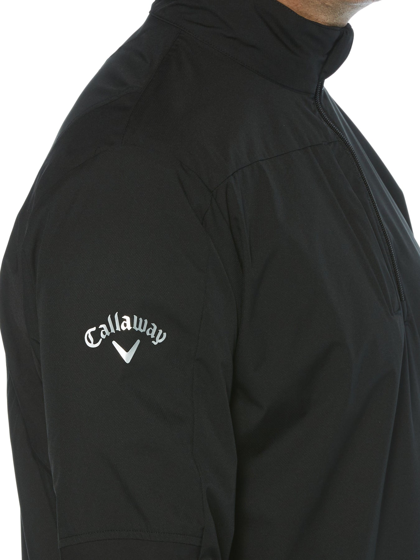 Whipping winds may put a slice on your shots, but they won't put a damper on your mood with our Men's 1/4 Zip Windshirt from the Callaway Standard Collection, which fuses our most classic look into a roomier fit. One of our lightest-weight jackets, this one is perfect for beating the wind and rain on warmer days, or layer up underneath for cooler playing temperatures. The wind stays out with our elastic sleeve-cuffs and elastic drawstring around the bottom. We also put stripes on the back and each elbow provide style and a Callaway Tour Logo on the right sleeve. Stretch: allows you to attack the green by providing your arms the freedom to produce a fluid swing and Repel: is created from lightweight materials and resists wind and water and Shield: gives your skin superior protection against UV rays.