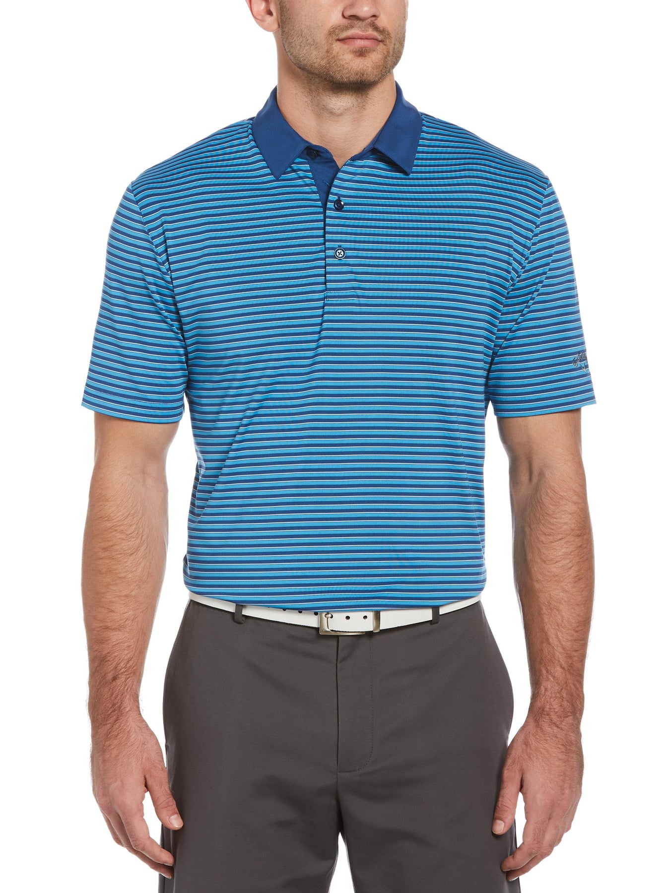 This Callaway men's golf polo is a combination of comfort and style It has a three-color striped print for visual interest and contains stretch for added flexibility. Opti Dri™ moisture-wicking and cooling technologies pull sweat and heat away from the skin to keep you cool and dry. Play with confidence knowing the built-in UPF 40 protection is helping to keep your skin safe from the sun's harmful rays.