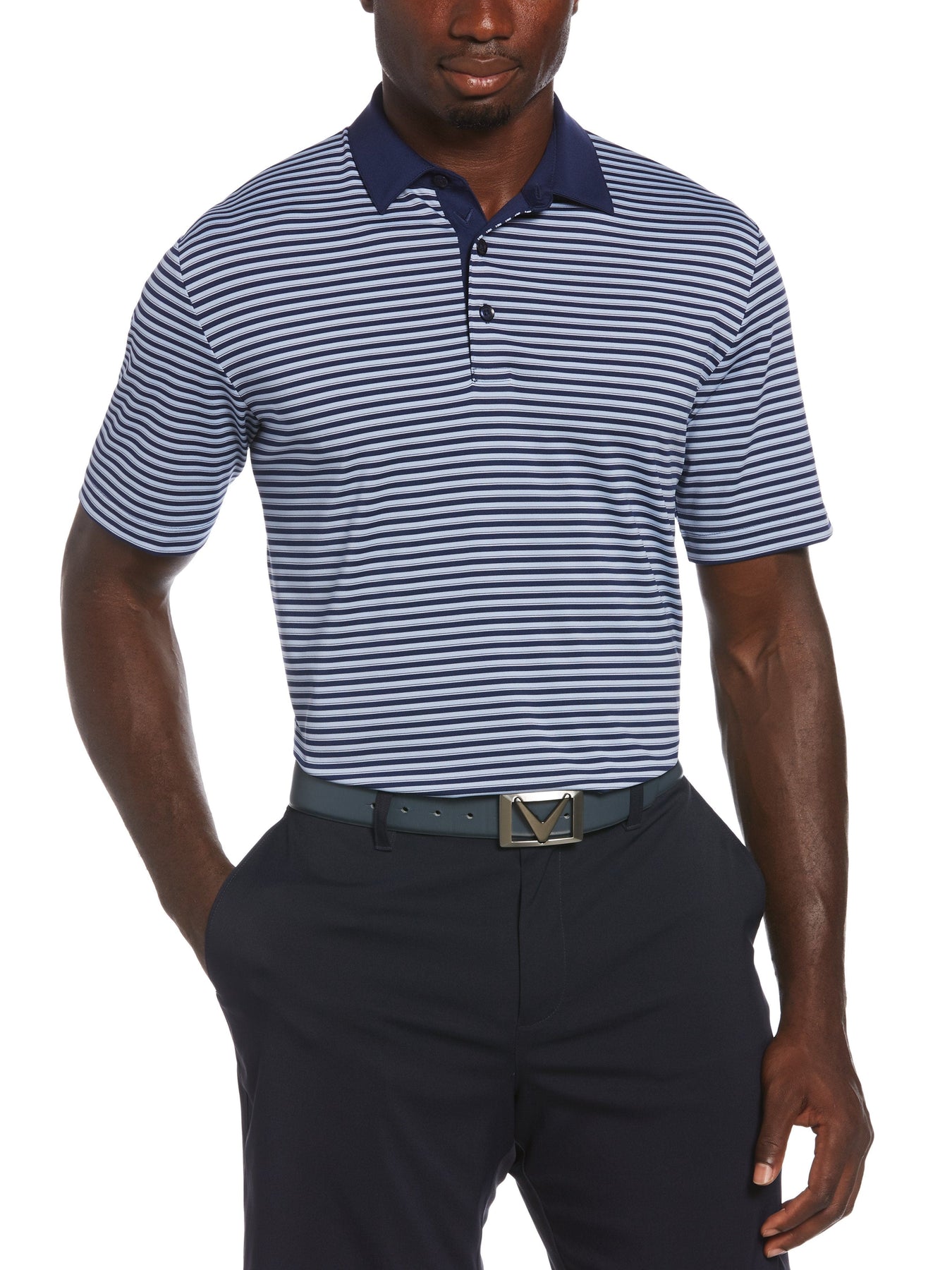 This Callaway men's golf polo is a combination of comfort and style It has a three-color striped print for visual interest and contains stretch for added flexibility. Opti Dri™ moisture wicking technology built into our men's golf shirts pulls sweat away from the body for on-course comfort throughout your round. Built-in sun protection prevents harmful UV rays from penetrating the fabric of the golf top, helping to protect covered skin on sunny days spent outdoors.
