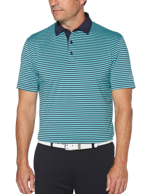 This Callaway men's golf polo is a combination of comfort and style It has a three-color striped print for visual interest and contains stretch for added flexibility. Opti Dri™ moisture-wicking and cooling technologies pull sweat and heat away from the skin to keep you cool and dry. Play with confidence knowing the built-in UPF 40 protection is helping to keep your skin safe from the sun's harmful rays.