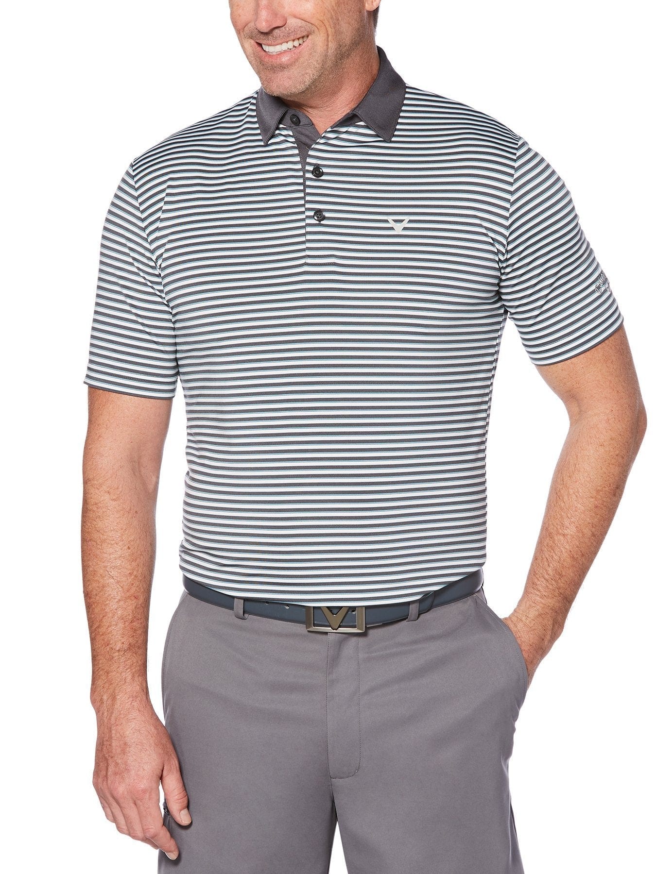 This refined Callaway men's golf polo features a stylish three-color yarn-dyed stripe print and contains stretch to maximize your range of motion. Built-in Opti Dri™ moisture-wicking and cooling technologies pull sweat and heat away from the skin to keep you cool and dry. This handsome golf shirt is equipped with UPF 40 protection to block out the sun's harmful rays while you play.