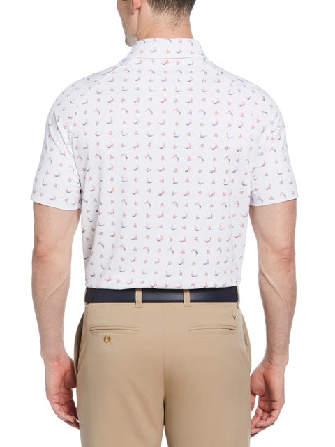 The Callaway Short Sleeve Abstract Chev Print Polo offers a modern twist on a classic golf style. This polo features an eye-catching abstract chevron print, providing a unique and stylish look on the course. Constructed from a blend of polyester, recycled polyester, and elastane, it offers exceptional stretch and freedom of movement thanks to Swing Tech™ technology. The fabric also provides UPF 50 sun protection and moisture-wicking properties to keep you comfortable and protected during your round. With a classic self-collar and easy-care design, this polo is a great choice for both style and performance.
