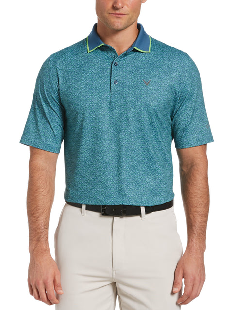 Keep your smart, athletic style on par with this Callaway men’s golf shirt. It features stretch fabric with Swing Tech™ technology for an enhanced range of motion that allows you to bend, twist and swing in comfort. Opti Dri™ moisture-wicking technology keeps you comfortable and dry. A subtle allover print and tipping on the ribbed collar add standout style to this versatile short sleeve golf polo.