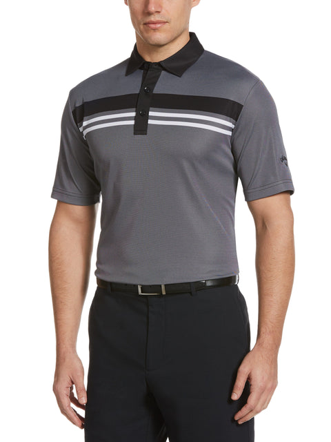A classic birdseye print and color block chest stripes with corresponding placket and collar combine to create this sophisticated Callaway golf polo. Packed with performance features, its stretch fabric provides a full range of motion for a smooth golf swing. Moisture-wicking technology keeps you dry, and cooling technology transfers heat away from your body to keep you cool. UPF 50 protects your skin from damaging UV rays.