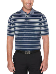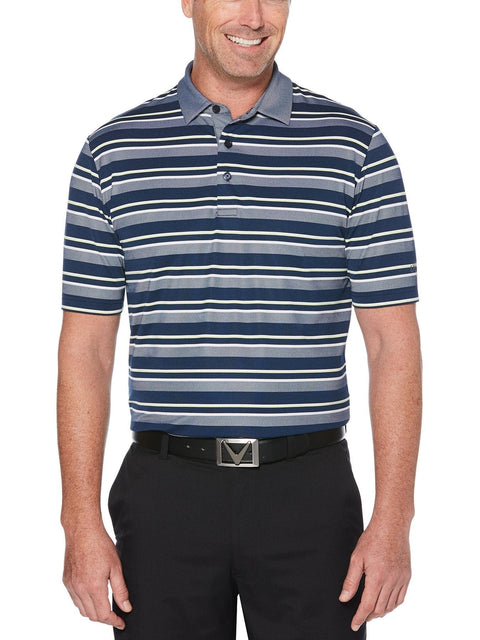 Perfect for a round of golf under sunny blue skies, this Callaway polo shirt has a casual striped design. Moisture-wicking technology keeps you comfortable and dry throughout your round. The stretchy double knit fabric allows you to bend and wind up smoothly into the best form for each tee shot, chip or putt.