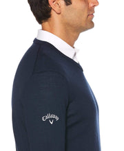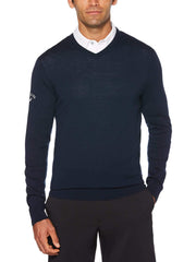 Merino wool blend fabric gives this sophisticated V-neck golf sweater an impressive balance of warmth, breathability and softness. The golf pullover's lightweight material resists wrinkling, keeping you looking sharp throughout your round. Anti-odor protection helps you stay fresh. Ribbing along the cuffs and hem gives the design a finished look and keeps the cold out.