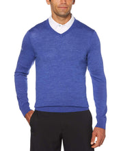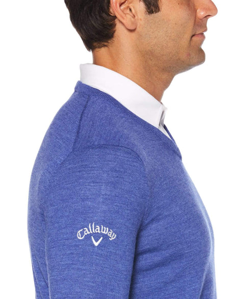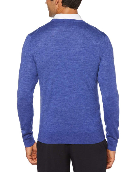 Merino wool blend fabric gives this sophisticated V-neck golf sweater an impressive balance of warmth, breathability and softness. The golf pullover's lightweight material resists wrinkling, keeping you looking sharp throughout your round. Anti-odor protection helps you stay fresh. Ribbing along the cuffs and hem gives the design a finished look and keeps the cold out.