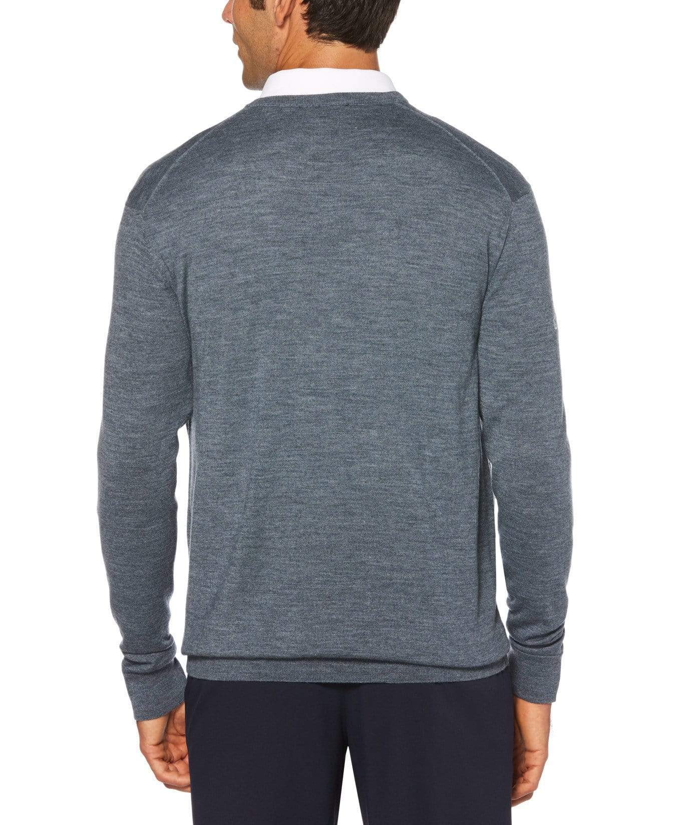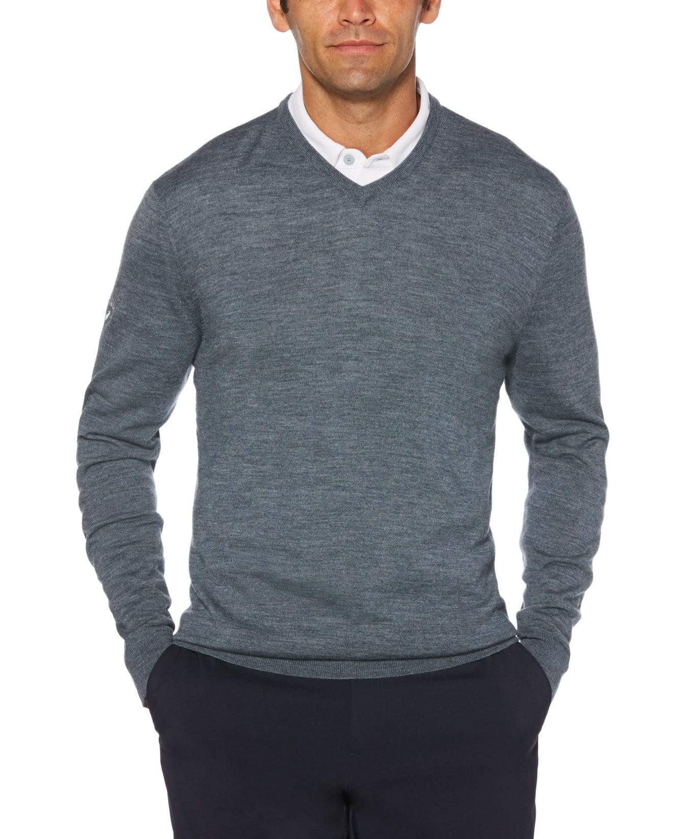 Merino wool blend fabric gives this sophisticated V-neck golf sweater an impressive balance of warmth, breathability and softness. The golf pullover's lightweight material resists wrinkling, keeping you looking sharp throughout your round. Anti-odor protection helps you stay fresh. Ribbing along the cuffs and hem gives the design a finished look and keeps the cold out.