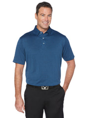 A polo that successfully cools you down during your golf round is few and far between. Fortunately for you, it's just one click away. This heather jacquard short sleeve polo from the Standard Collection, which fuses Callaway's most classic look into a roomier fit, equips itself with small square, two-toned patterning that puts a pep in your swing. Callaway's Opti Dri™ moisture wicking technology pulls sweat away from your body to keep you cool in the heat, cooling technology transfers heat away from your body to keep the garment cool and UPF 15 provides superior protection by blocking the sun's harmful UV rays.