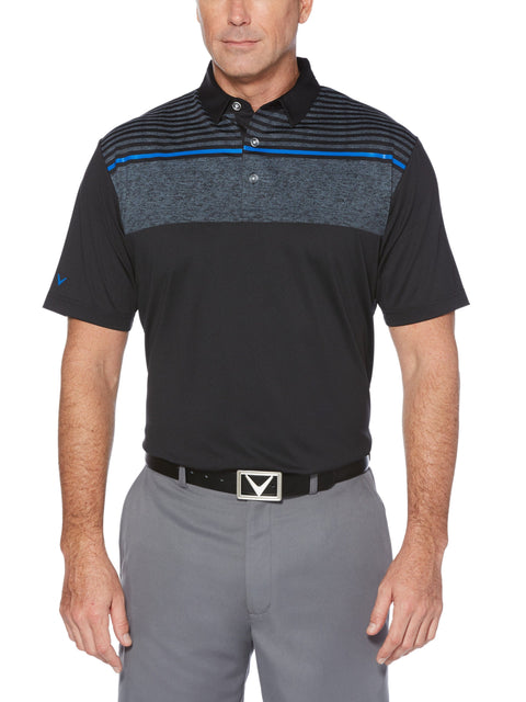 Play through with comfort and style in this pigment print short sleeve golf polo from the Standard Collection, which fuses Callaway's most classic look into a roomier fit. Pigment printing through the chest creates a mottled appearance, while stripes forming downward from the shoulders create an added element of style. Callaway's Opti Dri™ moisture wicking technology pulls sweat away from your body to keep you cool in the heat, cooling technology transfers heat away from your body to keep the garment cool, stretch fabric is created by interwoven layers that ensure maximum range of motion and UPF 15 provides superior protection by blocking the sun's harmful UV rays.