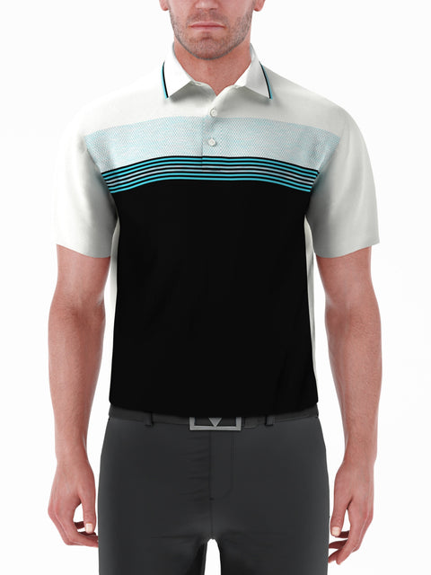 Designed for effortless movement with every shot, this performance golf polo is equipped with Swing Tech™ for added stretch in the shoulder seams for a full range of motion. Opti Dri™ moisture wicking technology built into our men's golf shirts pulls sweat away from the body for on-course comfort throughout your round. Engineered stripes and a micro geo print at the chest add eye-catching style while complementing the tipping on the ribbed collar.