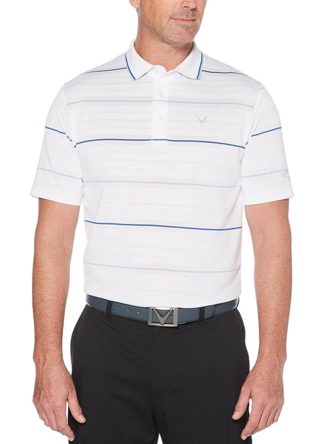Roadmap stripes and a subtle herringbone texture add energy and flair to this classic Callaway golf polo. The golf shirt features moisture-wicking technology to move perspiration away from your body, keeping you comfortable and dry from the first hole to the last. UV Block protection helps to shield you from harmful ultraviolet rays.