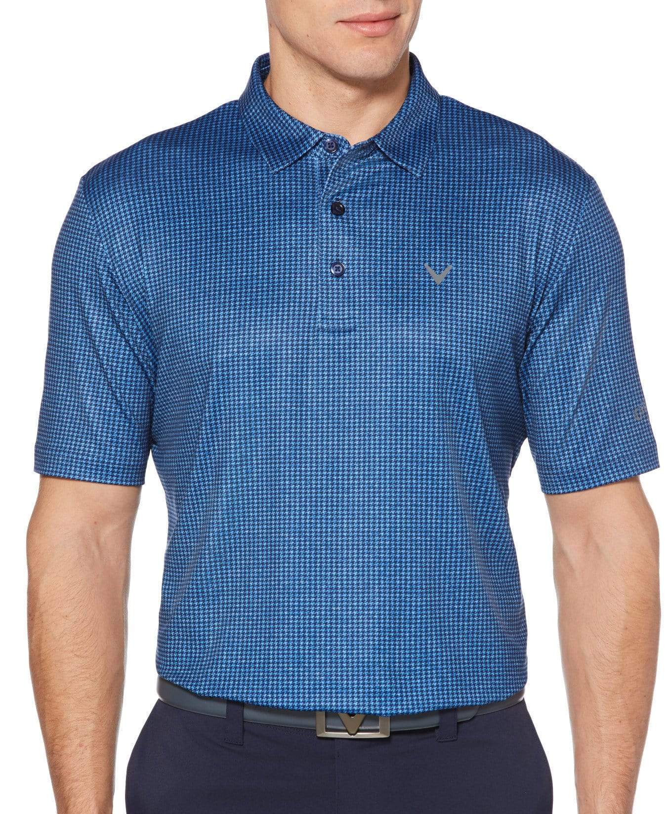 With it's classic houndstooth print, this Callaway men's golf polo is a stylish addition to any golfer's wardrobe. It's crafted with performance features to match, including stretch fabric that moves with you to maximize range of motion. Opti Dri™ Moisture-wicking technology keeps you cool and dry, and UV Block UPF 50 protects your skin from harmful UV rays. Make every stroke count in this feature-rich and fashionable golf shirt.