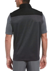 Stay warm and comfortable in this sleeveless performance golf vest. The fleece fabric and quilted shoulder detail provide sun protection on the course.