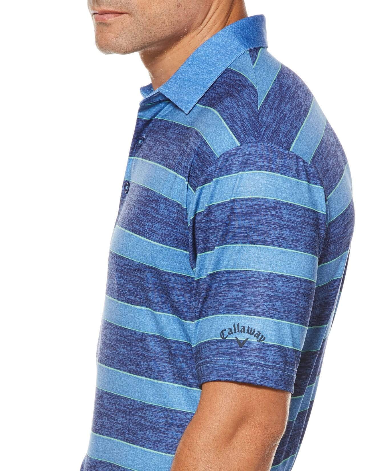 Rotate off the driving range and get hit the links in this Callaway heathered rugby stripe polo. Horizontal stripes are separated by thin lines for an added emphasis. You shirt is finished with a heathered fabrication, alternating between light and darks threads to create a two-toned look. Jersey fabrication creates tiny slits in the polo that maximizes breathability and allows you to cool down quickly. Callaway's Opti Dri™ moisture wicking technology pulls sweat away from your body so you can cool down in the heat, Opti-Stretch allows you to attack the green by providing your arms the freedom to produce a fluid swing and Opti-Shield gives your skin superior protection against the sunÂs UV rays.