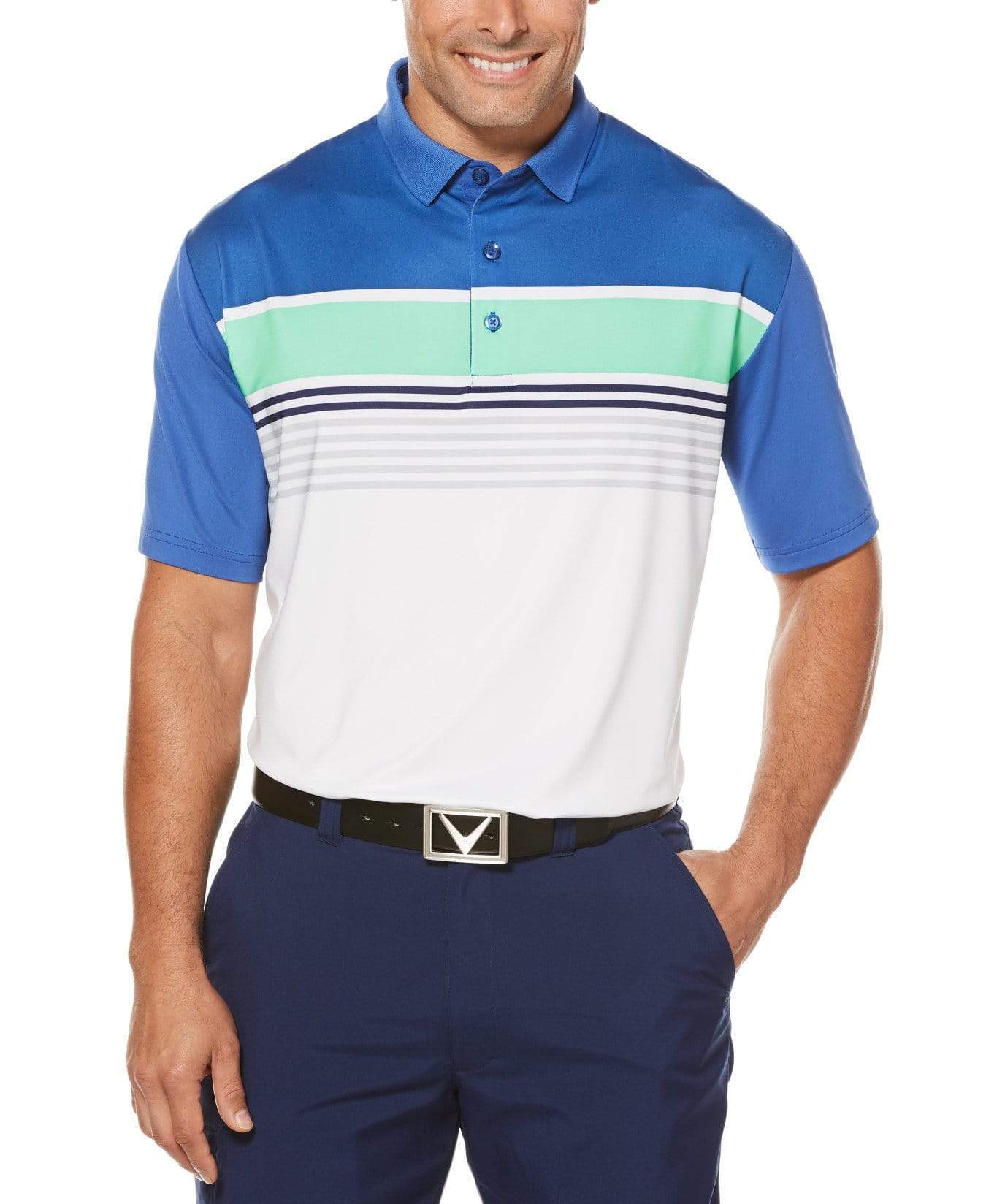 Drive the golf ball down the middle of the fairway in your Callaway roadmap striped polo shirt. Color blocking separates the shoulders and sleeves from the main body, which is designed with a series of stripes that begin at the chest. Jersey fabrication maximizes breathability and allows you to cool down quickly. Callaway's Opti Dri™ moisture wicking technology pulls sweat away from your body so you can cool down in the heat, Opti-Stretch allows you to attack the green by providing your arms the freedom to produce a fluid swing and Opti-Shield gives your skin superior protection against the sunÂs UV rays.