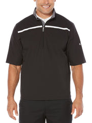 Whipping winds can sure throw off your ball flight and mess with game. This Callaway short sleeve windshirt will help you fend off inclement weather in style and win. The solid-colored, lightweight pullover jacket has a solid stripe running across the chest and is crafted with an adjustable elastic cord at the bottom hem. It features stretch fabric spanning the shoulder blades so you can swing in comfort. Callaway's Repel resists wind and water with its lightweight fabrication and Stretch allows you to attack the green by providing your arms the freedom to produce a fluid swing.