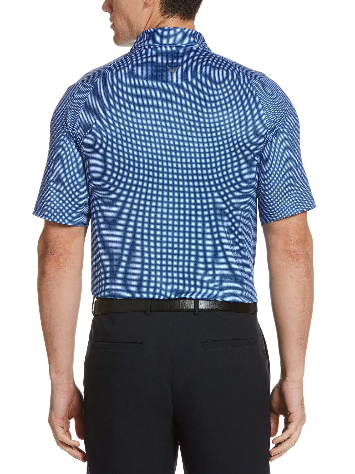 Maximize your performance in this Callaway men's golf polo. This versatile golf shirt has a subtle allover gingham print that pairs easily with a variety of bottoms. It's crafted from a durable stretch material with built-in Swing Tech technology to enhance your range of motion. A self collar with three-button placket add classic polo style and Opti Dri™ moisture-wicking technology pulls sweat away from your body to keep you cool and dry.