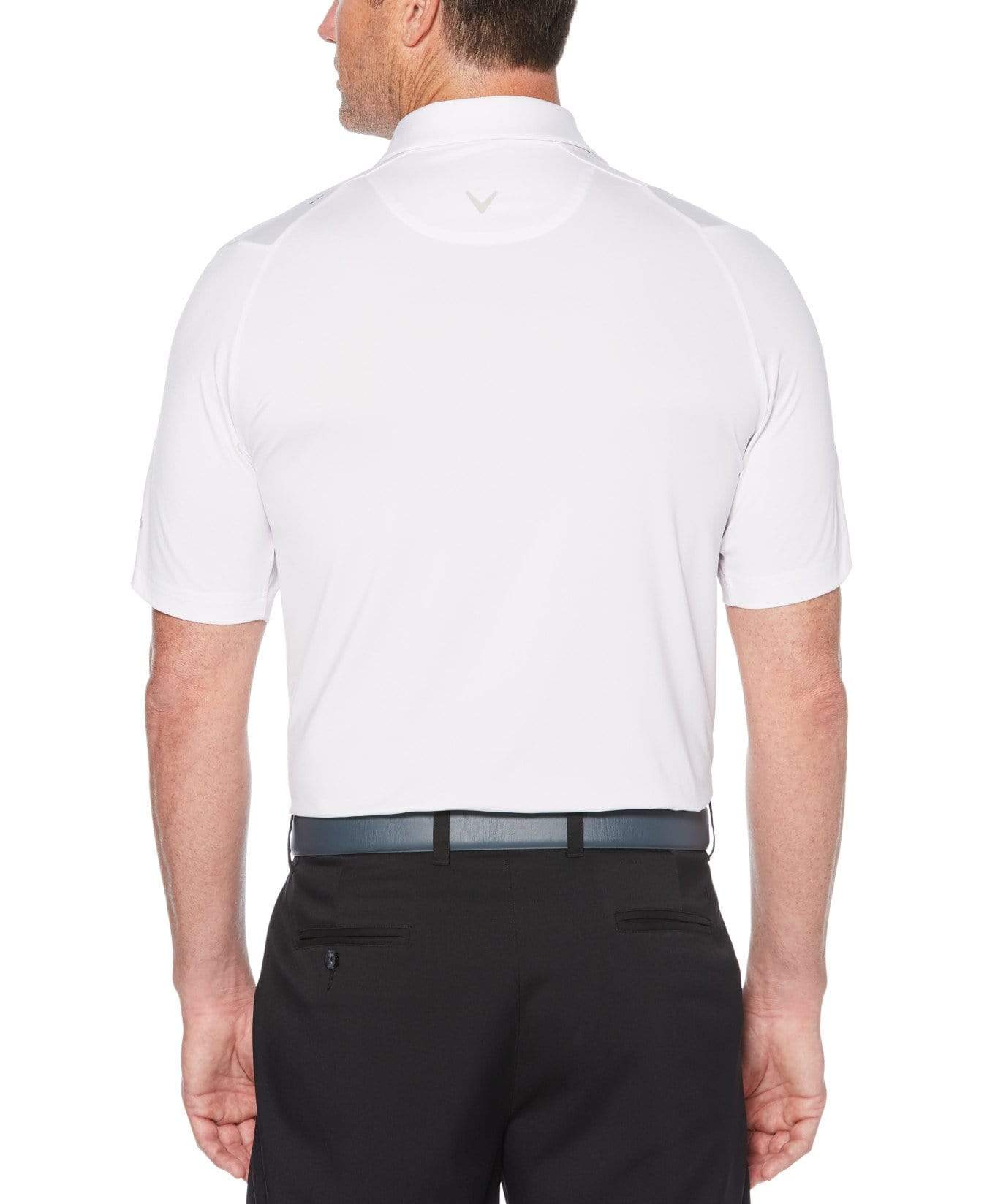 Featuring two stripes across the chest with contrasting segments, this Callaway golf polo puts a fresh twist on a classic design. The mens golf shirt is crafted from stretch fabric and designed with Swing Tech shoulders to ensure that it wont restrict your swing. Moisture-wicking fabric helps you stay cool and dry, while the soft finish keeps the golf top comfortable to wear all day long. UV Block UPF 50 protection helps to guard against sunburns.