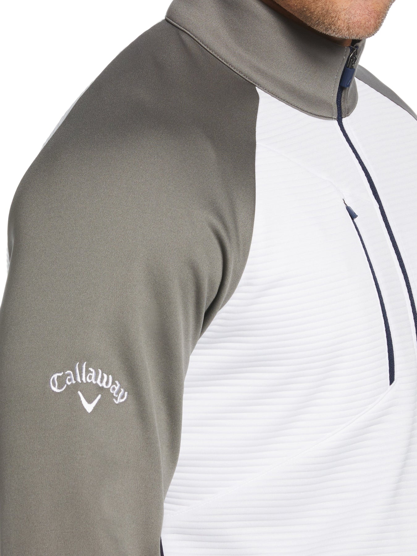 This Callaway Weather Series™ golf pullover is crafted from soft, midweight fleece for warmth that won't weigh you down. Thick, double-knit thermal fabric creates a barrier between you and the cold, while a high mock neck keeps the wind at bay. Designed for effortless movement with every shot, this golf outerwear is equipped with Swing Tech™ for added stretch in the shoulder seams for a full range of motion. A zippered chest pocket keeps essentials close by, and a 1/4 zip collar makes it easy to remove the men's golf pullover if the weather warms up.