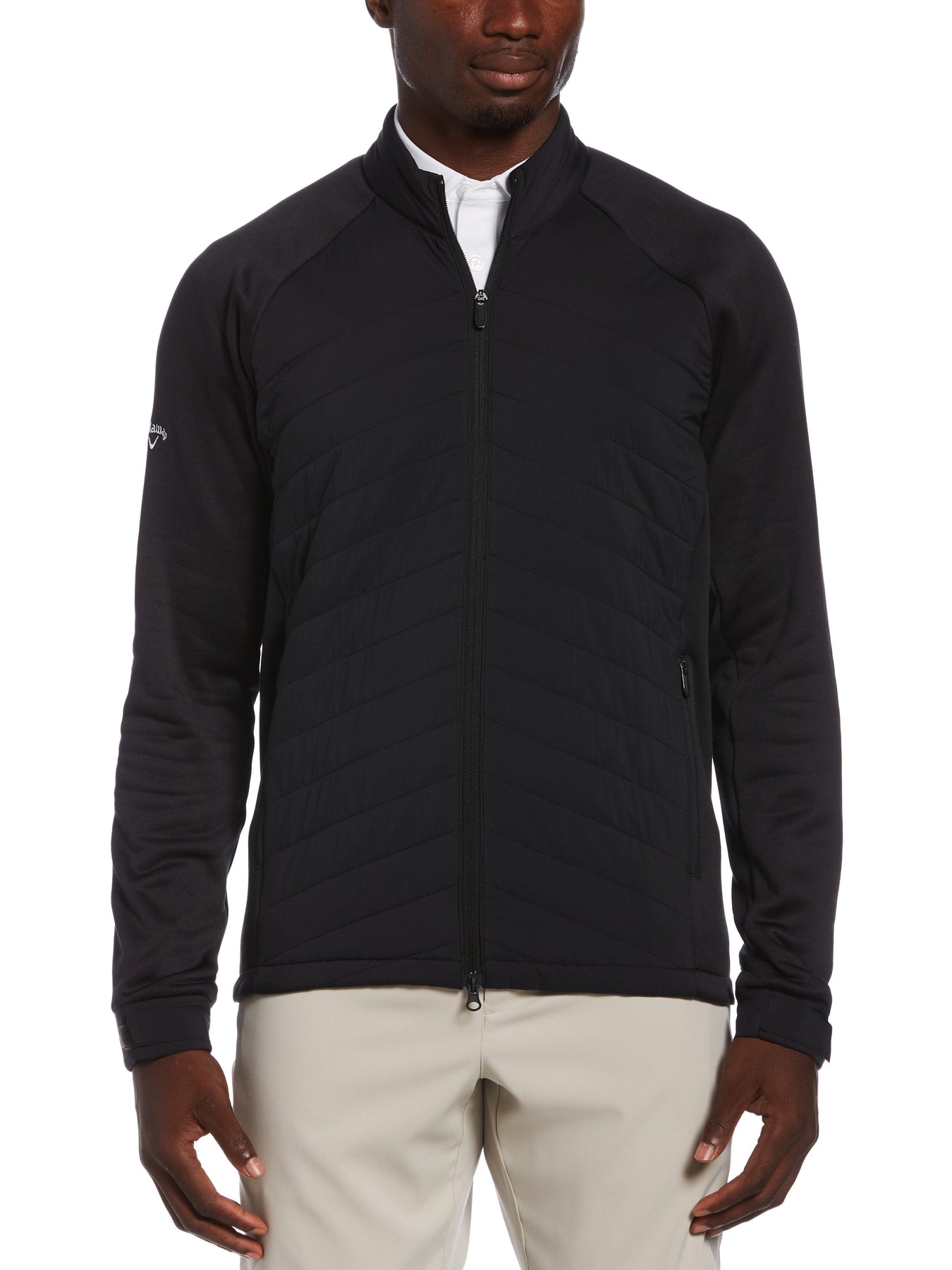 With this Callaway Weather Series™ puffer golf jacket in the rotation, cooler days won't keep you off the course. Offering warmth without bulk, the breathable jacket contains Primaloft® Insulation that delivers warmth, softness and lightweight comfort derived from post-consumer recycled materials. Designed for effortless movement with every shot, this golf outerwear is equipped with Swing Tech™ for added stretch in the shoulder seams for a full range of motion. For ultimate convenience and comfort in colder weather, this quilted jacket has a two-way zip with snap-down closure, zippered hand pockets, adjustable cuffs and waistband and a high mock neck.